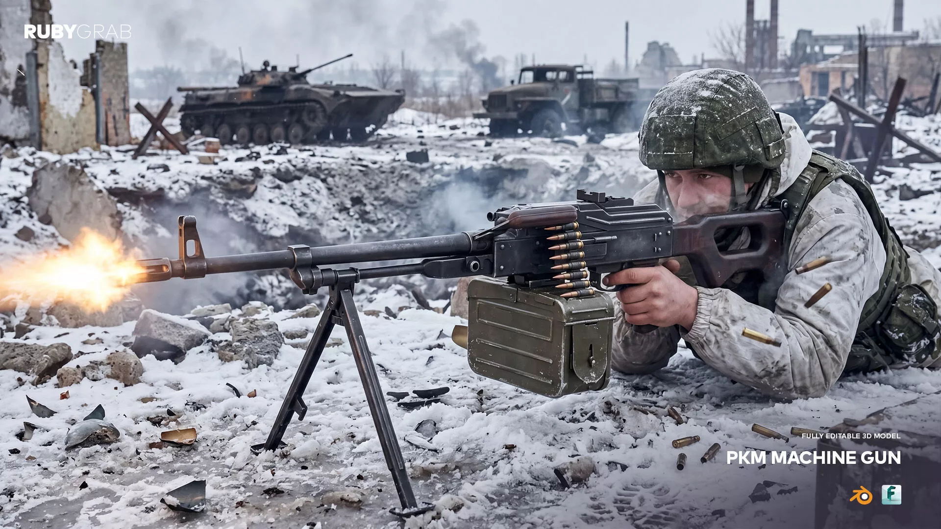 PKM 3D Model: A fully detailed and editable model of the PKM machine gun, perfect for games, animations, or 3D visualization projects. Designed with precision, it ensures a realistic and high-quality representation of the iconic weapon. Compatible with Blender and other major 3D software.