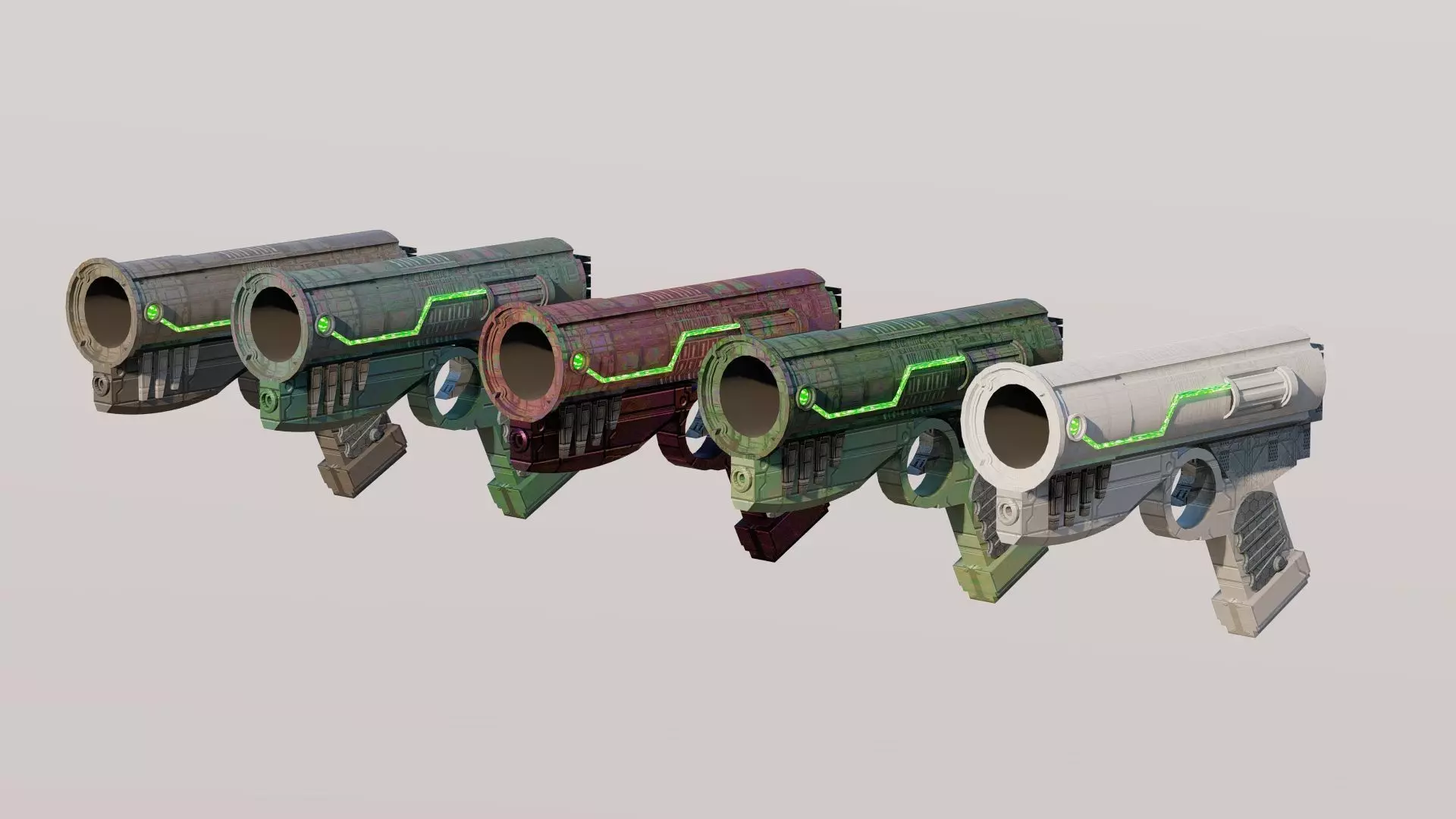this is an 3d model of plasma gun/ pistol, it contains *5 different skins *that are gray/black, aquamarine blue, red, green and white.
