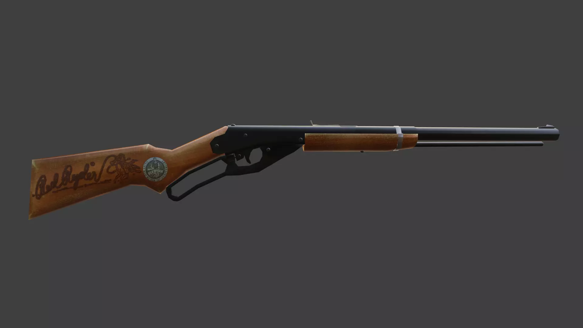 Low Poly Red Ryder BB Gun modeled after 70th animversary model from 2010. Renders are from Blender EEVEE real time renderer.