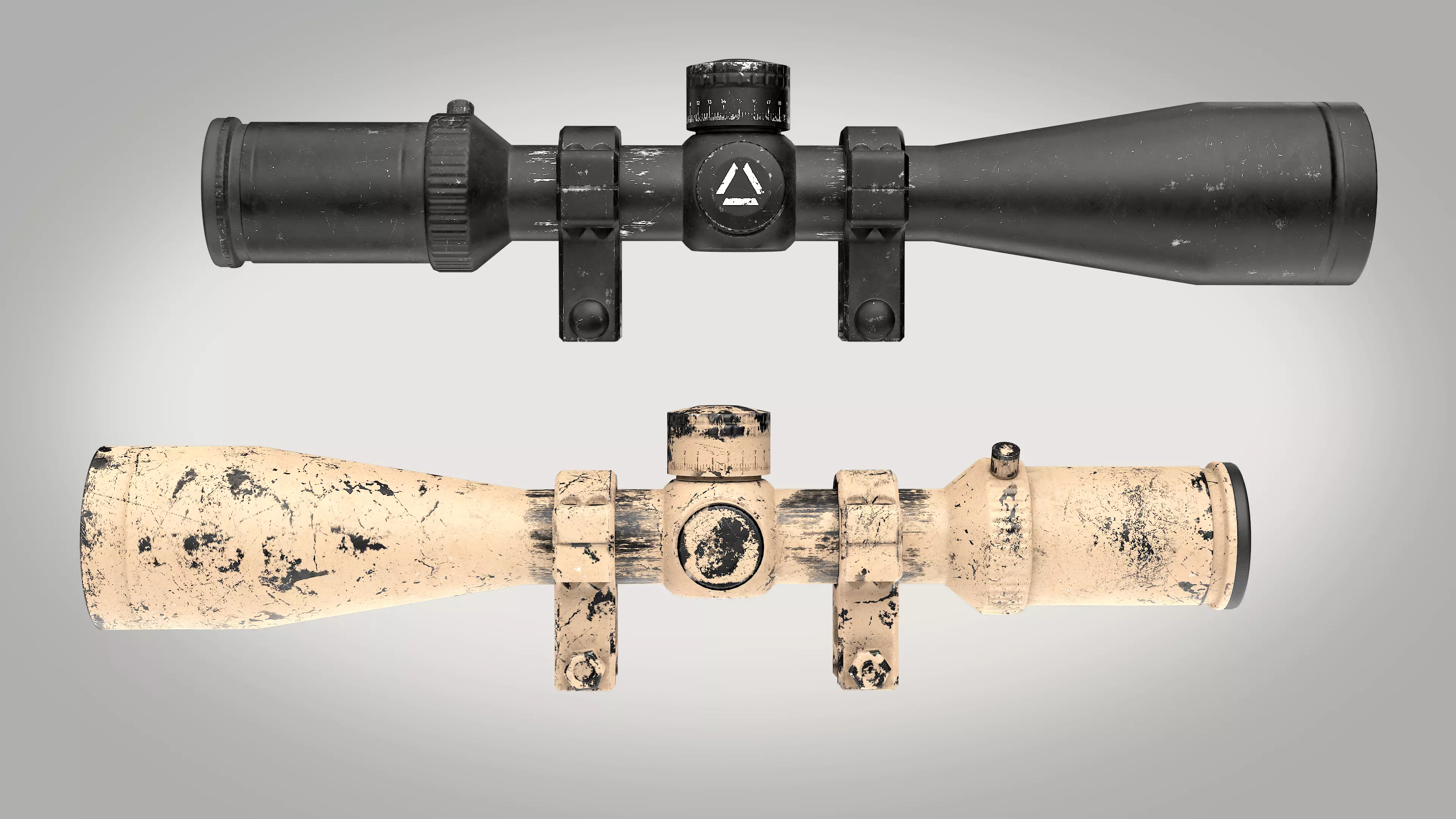 Rifle_Scope. Low poly model with two Texture sets(PBR). Originally created in Maya. Preview rendered with Marmoset Toolbag 4Model info:All objects, textures and materials are named appropriately. The model is built in a real scale. Clean topology. Geometry is fully triangulated to ensure the best shading. There are 5 separate parts in this mode The model has - 7398 tris / 3703