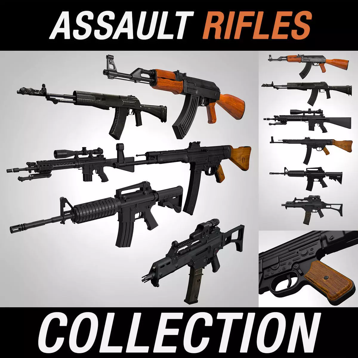 Assault Rifles Collection is a versatile set of 6x high quality, photo real models that will enhance detail and realism to any of your rendering projects. The model has a fully textured, detailed design that allows for close-up renders, and was originally modeled in 3ds Max and rendered with Cinema 4d.