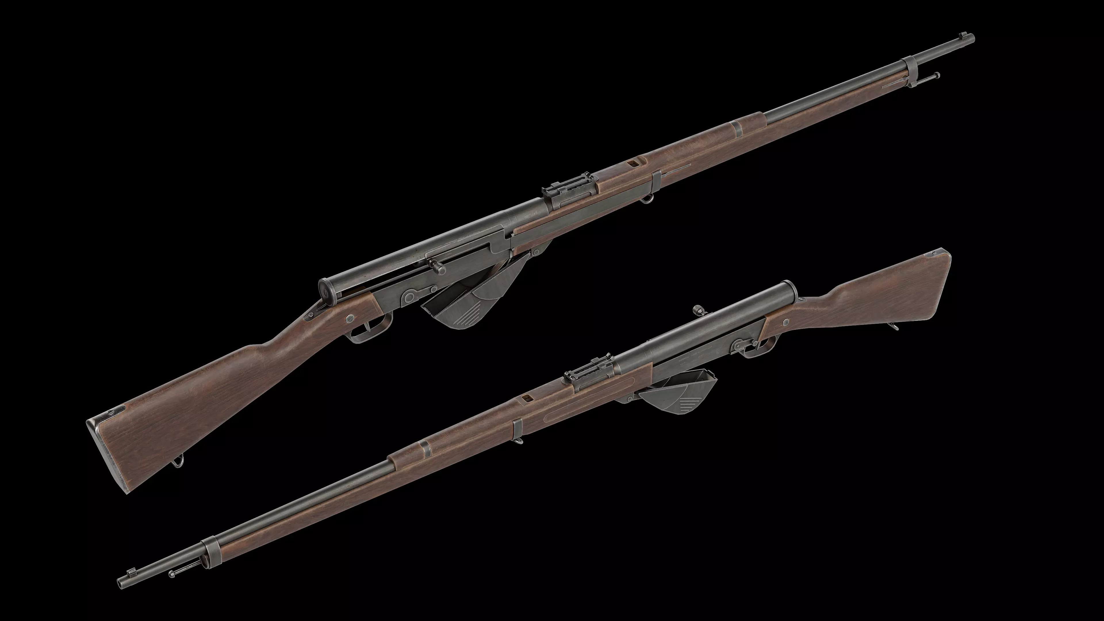 The Fusil Automatique Modèle 1917 (often called the RSC M1917) was a French semi-automatic service rifle introduced during World War I to increase infantry firepower. Developed by engineers Paul Ribeyrolles, Charles Sutter, and Louis Chauchat, it was designed to give standard infantry units a faster rate of fire than the bolt-action Lebel Model 1886 rifle then in service. The rifle used a gas-operated mechanism and was chambered for the 8×50mmR Lebel cartridge, feeding from a five-round en-bloc clip inserted into a magazine beneath the receiver. Introduced in 1917, it became one of the first semi-automatic rifles issued in meaningful numbers to regular troops rather than being limited to experimental or specialist use. Although it improved the soldier’s rate of fire, the rifle had drawbacks such as sensitivity to dirt and a somewhat complex mechanism adapted to the rimmed Lebel cartridge. Despite these issues, the M1917 represented an important step in the evolution of infantry rifles and influenced later French semi-automatic designs.