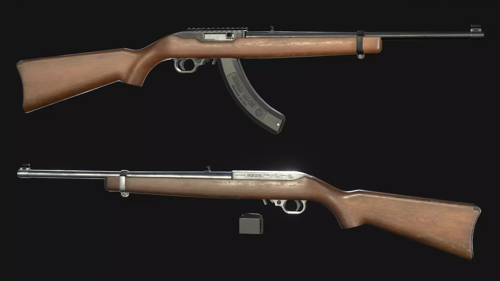 Ruger 10/22, a very popular civilian sporting and hunting rifle known for it's affordability and wide variety of aftermarket parts. The name 10/22 came from the standard magazine capacity of 10 rounds, and .22 Long Rifle cartridges it's chambered in. This particular version is the Carbine varient, which is the standard model with 18.5 inch barrel._Please note that proportions may not be 100% correct. This model isn't made for 3D printing, it was made for use in games. _