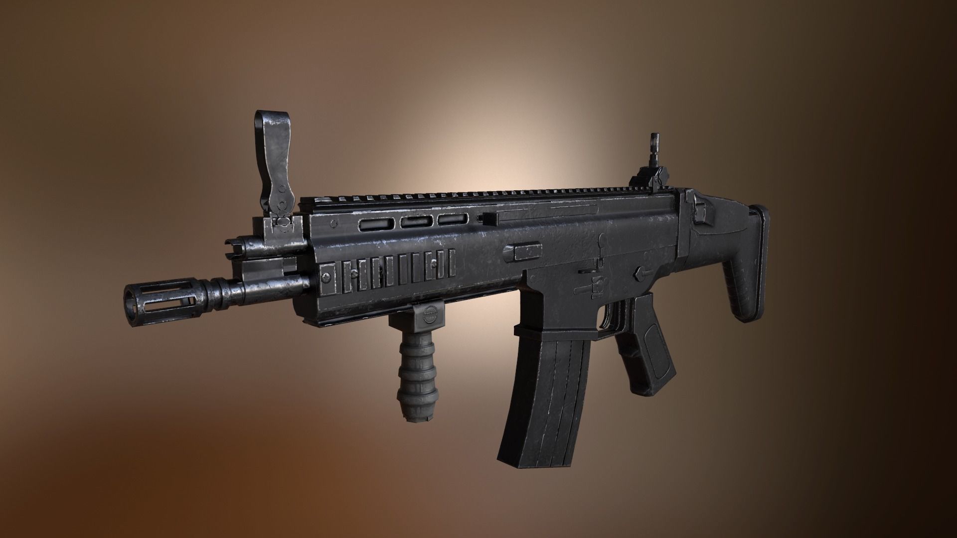 Model of the SCAR H assault rifle Game Ready, Only 9,952 Tris.1 texture set 2048x2048 resolution- easy scalable to 1 or 4k.PBR textures-Albedo -AO -Metallic -Normal -RoughnessUnity - 1 texture set 2048x2048 resolutionUnreal 5 - 1 texture set 2048x2048 resolutionReal world scale - 3.4 cm 40cm 16cm - 1.33 inch 15.74 inches 6.29 inchesModel set in 0,0,0 location