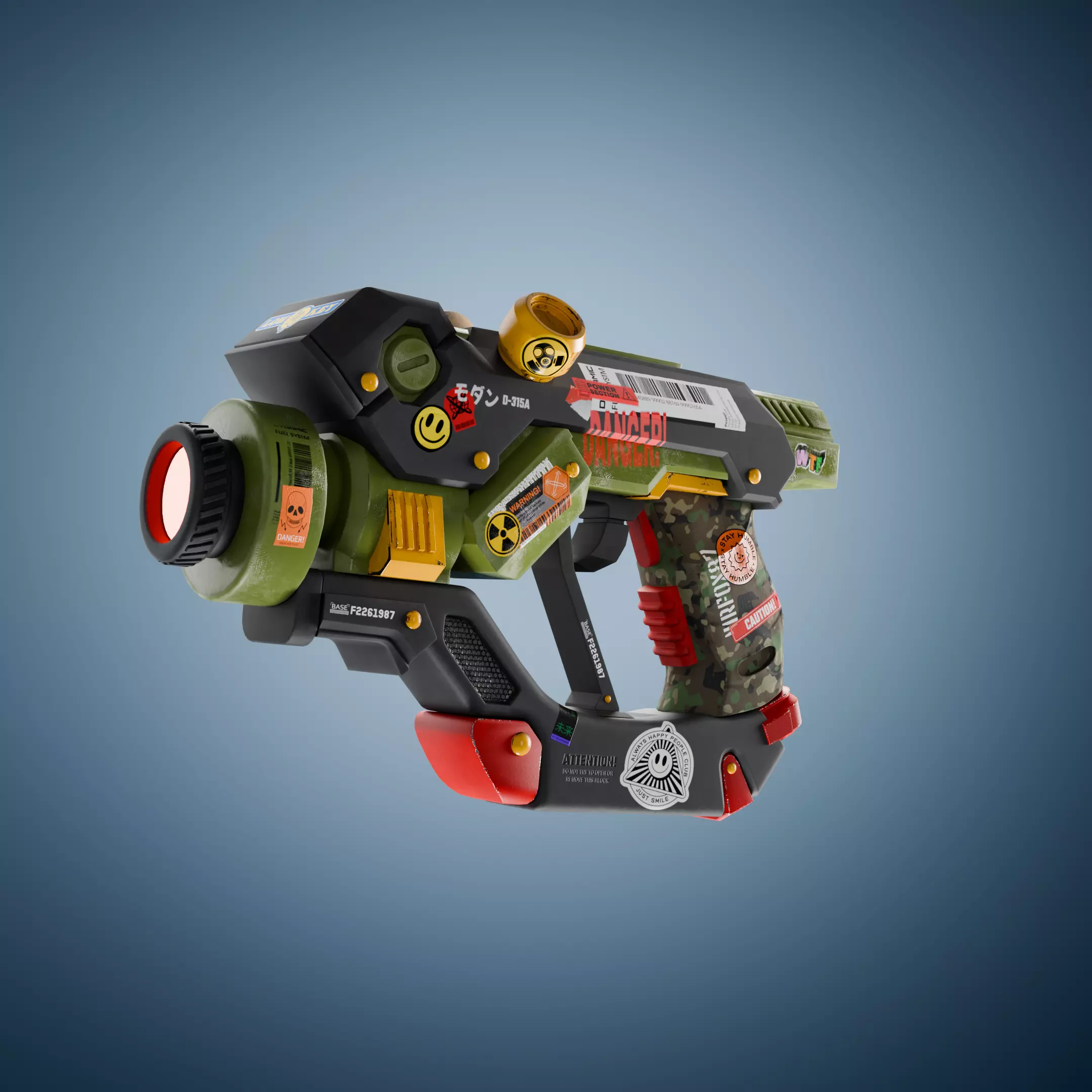 A stylized sci-fi handgun. The concept merges military elements with a playful sticker-covered aesthetic, aiming to create a visually engaging and readable design. The modeling was done in Blender, and the texturing was created using Adobe Substance. The gun emits a thick red laser and shakes in a cartoonish way, enhancing its fun, animated character.