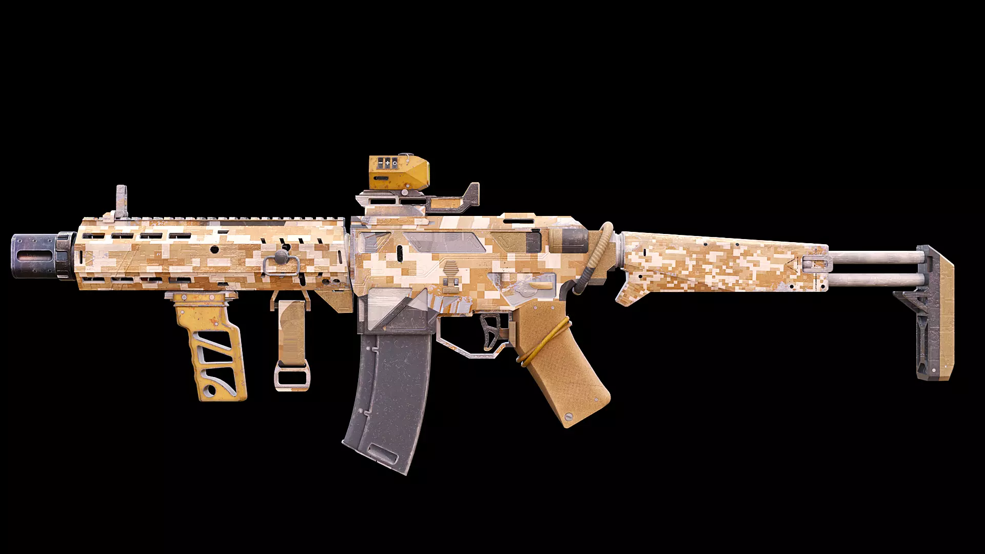 A high-quality, game-ready 3D model of a Sci-Fi Tactical Assault Rifle. This model features a unique desert digital camouflage skin and is perfectly optimized for first-person shooters (FPS) and third-person action games. Designed with a focus on clean topology and efficient UV mapping.