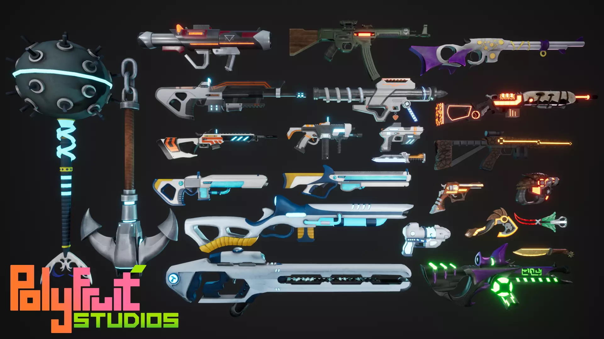 This pack contains 24 unique sci-fi weapons created for use in the Unreal Engine, featuring optimized topology and clean UVs; these weapons can be easily implemented into any game project.
