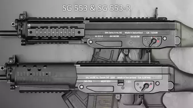 SIG's SG 553 (5.56x45mm) and SG 553-R (7.62x39mm) assault rifle, with a modern flat top upper receiver.