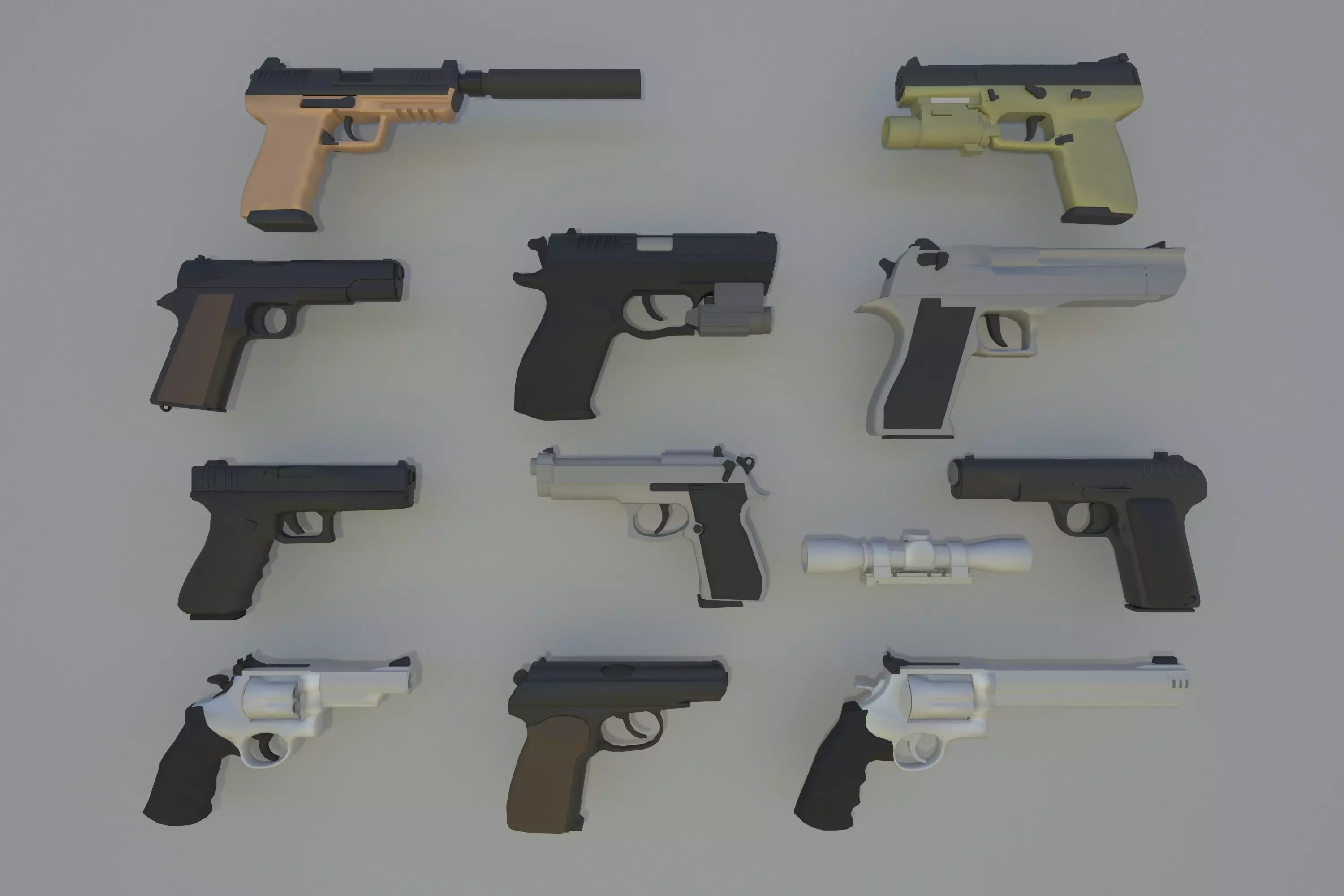 This file contains 10 pistols, 2 Under barrel Flashlight, Dumper for HK45, Optical sight with mount for Smith & Wesson-460XVR: