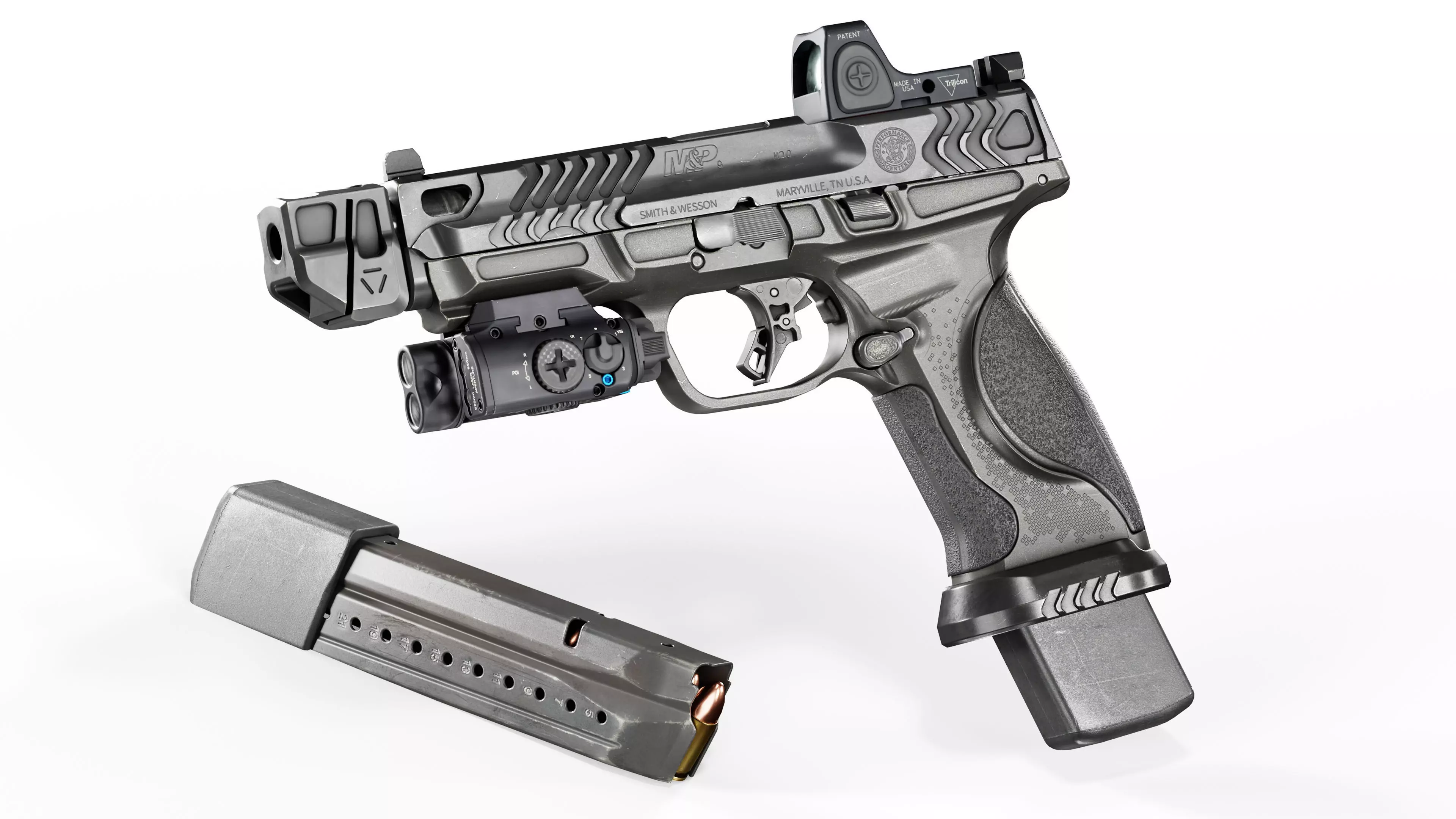 Game-ready 3D Model inspired by the Smith & Wesson SPEC SERIES M&P Pistol. This asset is rigged for easy animation and includes two texture variations for the magazine: one without numbers and one with numbers (note: one side is mirrored for optimization purposes). An inspired Trijicon RMRcc red dot sight (no card for the dot included) and SureFire XVL2 light are also included in this pack.