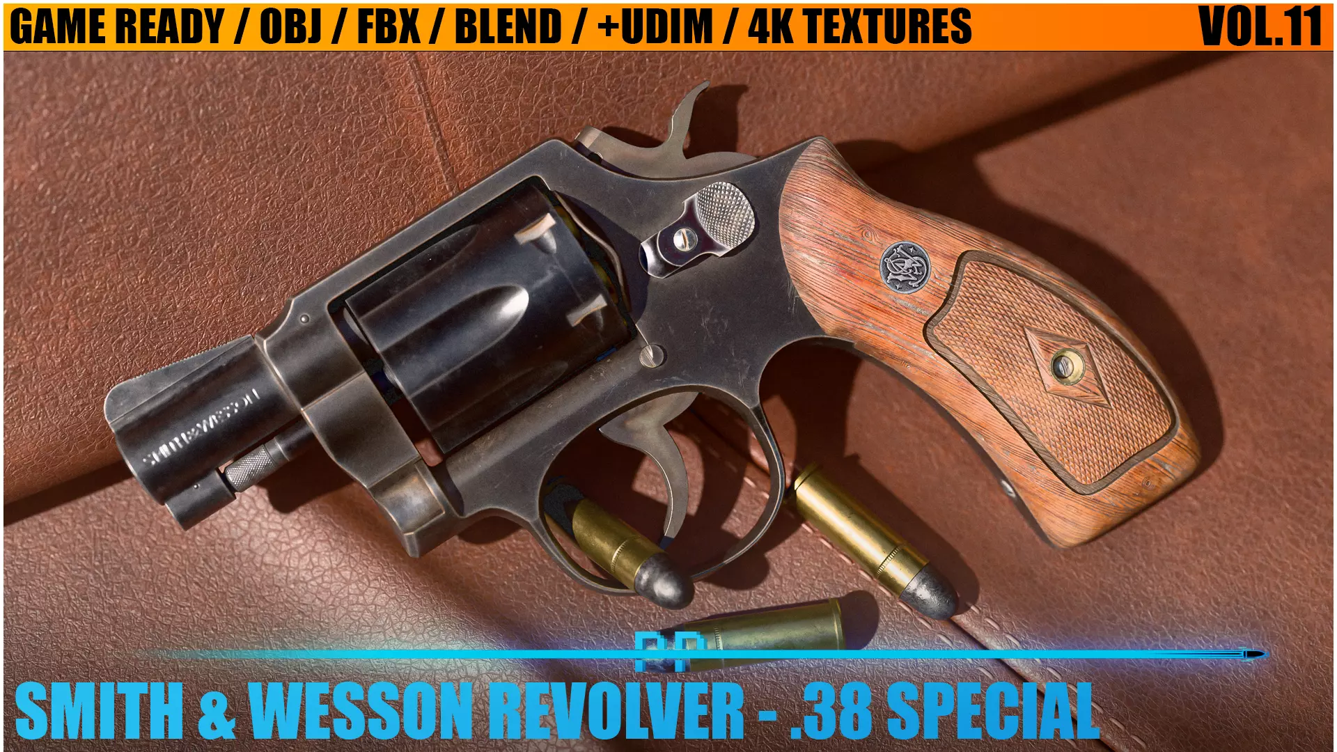 Game-ready Smith & Wesson Model 10 Snub Nose Revolver - .38 Special + .38 Special ammo model in FBX, OBJ, and Blend formats.