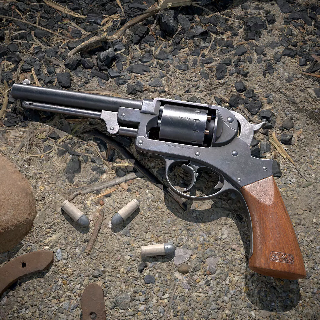 A Starr revolver (Starr DA) is a double-action revolver which was used in the western theater of the American Civil War until the United States Army Ordnance Department persuaded the Starr Arms Co. to create a single-action variant after discontinuation of the Colt. Low poly game ready model PBR metallic roughness16k tris