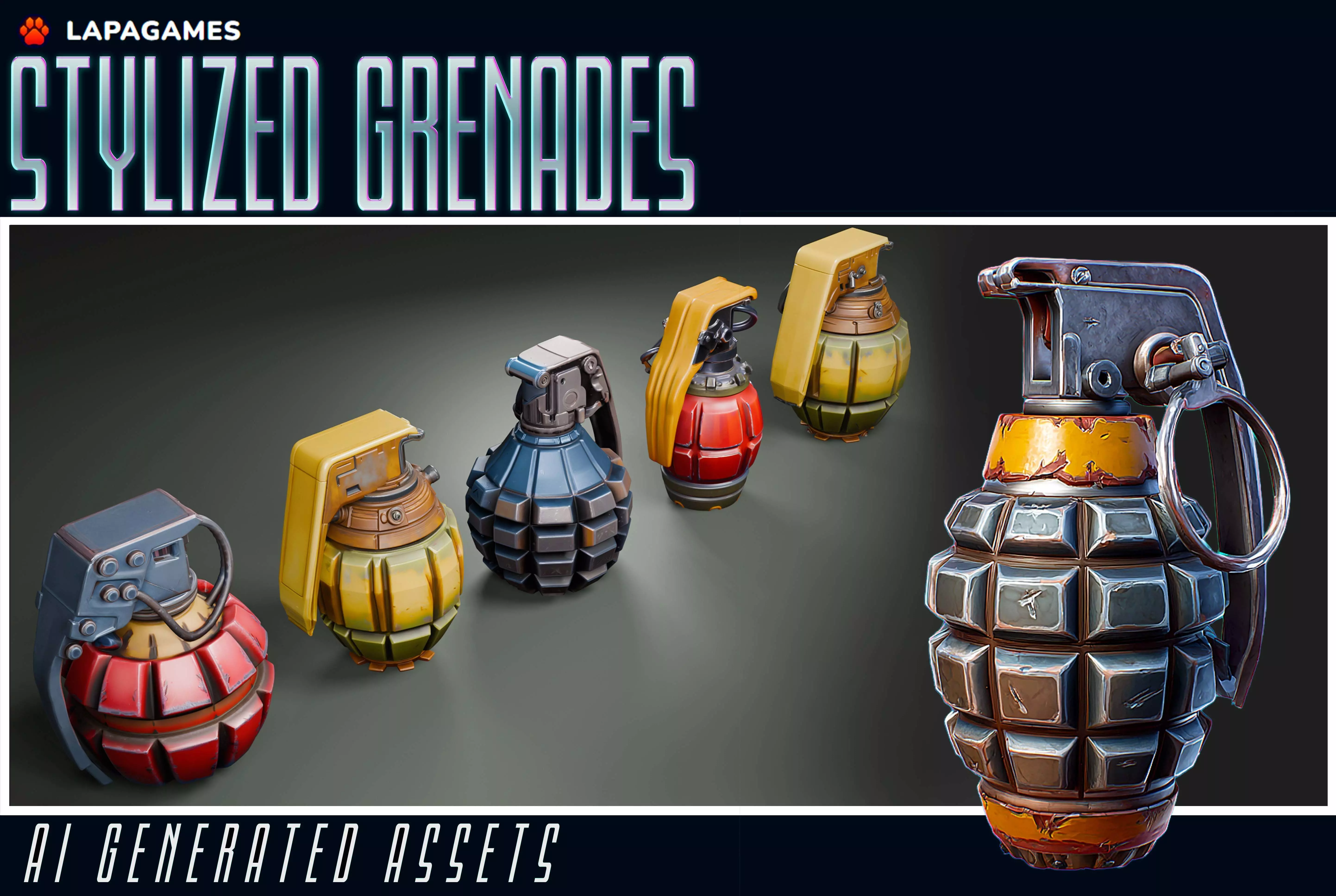 A collection of high-quality stylized grenades, perfect for shooters, action games, sci-fi environments, military scenes, or stylized FPS/TPS projects.Each grenade features unique shapes, color palettes, stylized materials, mechanical details, pins, levers, and clean PBR texturing.