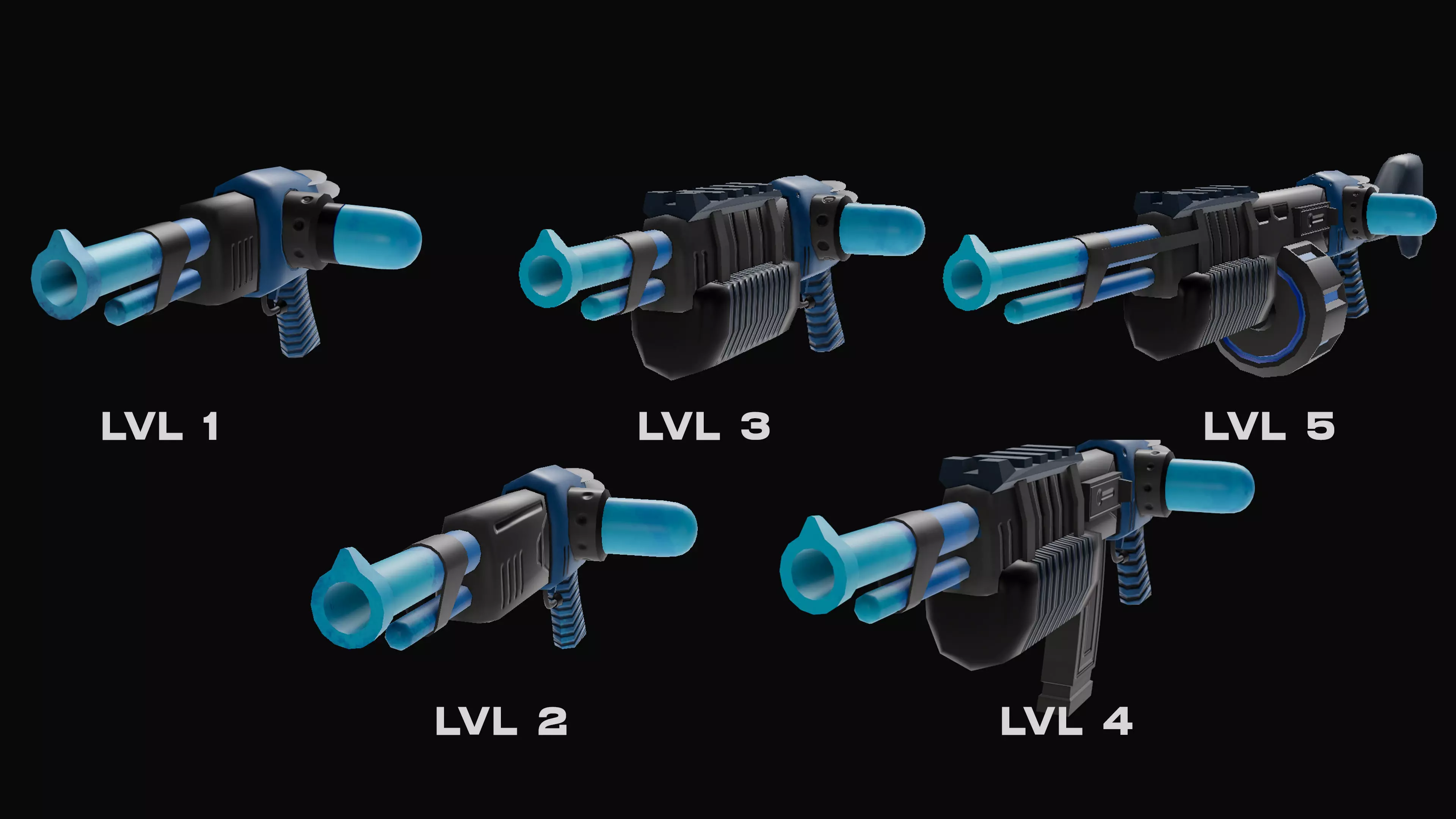 Sci-Fi Battle Weapons designed for integration into video games, 5 levels of each one and gives you ability to add upgrade option easily.