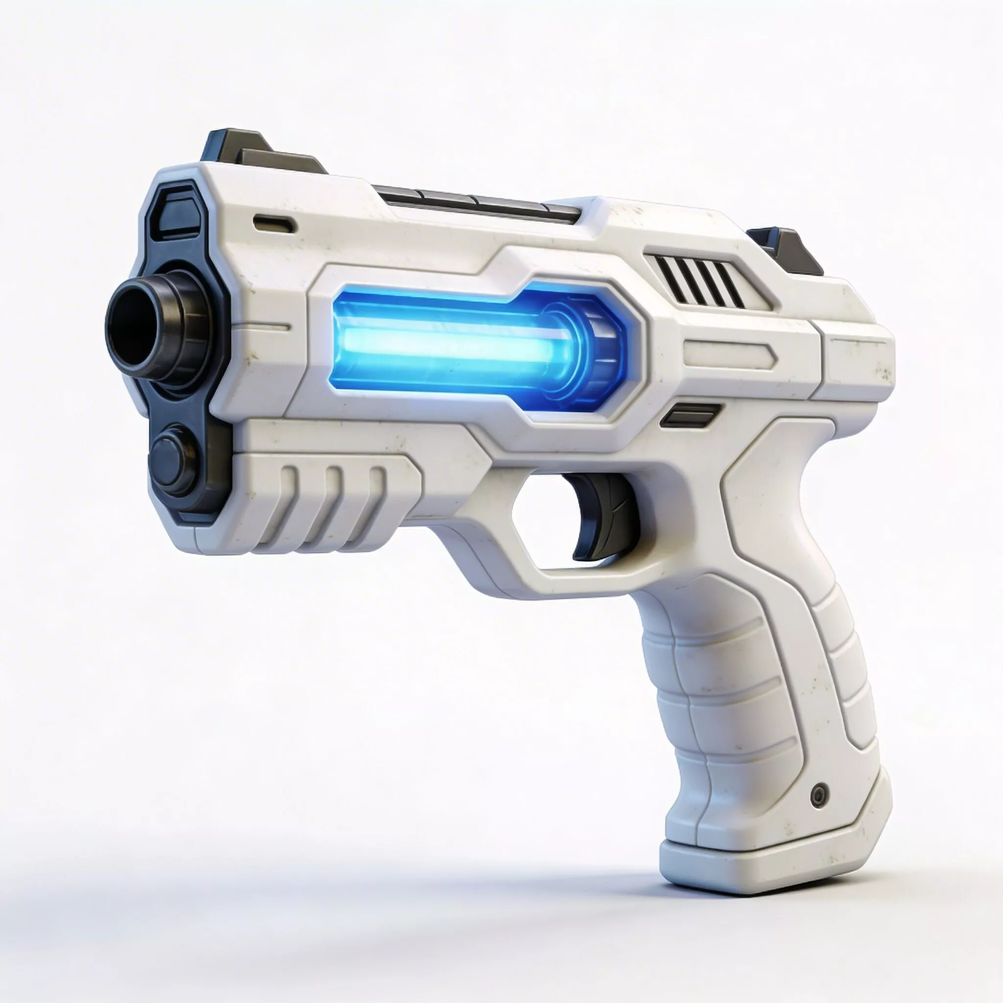 Tagsblaster pistol gun scifi weapon stylized futuristic glowing blue energy plasma white game asset prop shooter arcade sidearm laser military