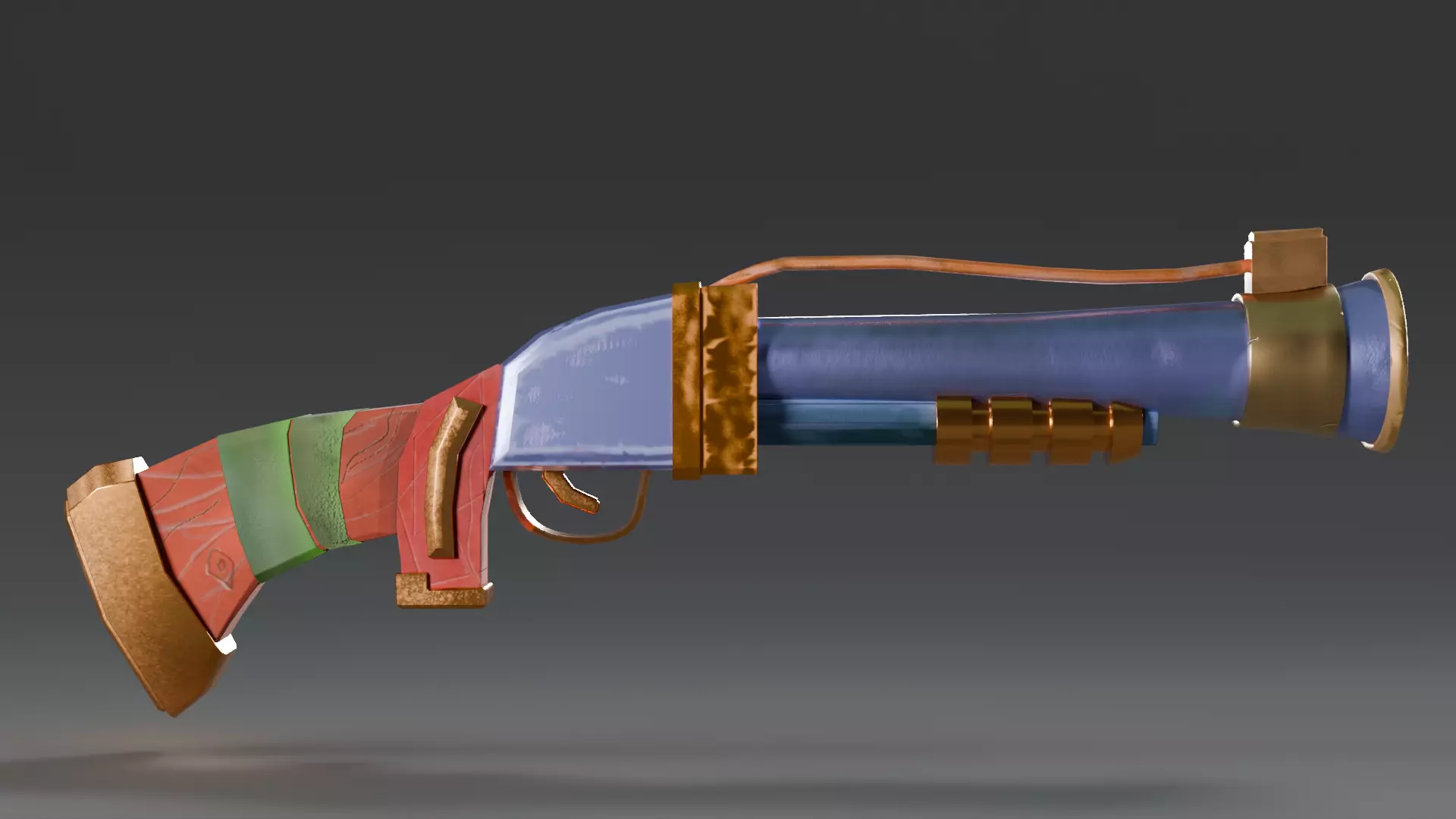 stylized shotgun 3D model, designed for games, VR/AR, and real-time applications. The asset is fully UV unwrapped with non-overlapping UVs and optimized for performance, making it ideal for game engines and interactive projects.