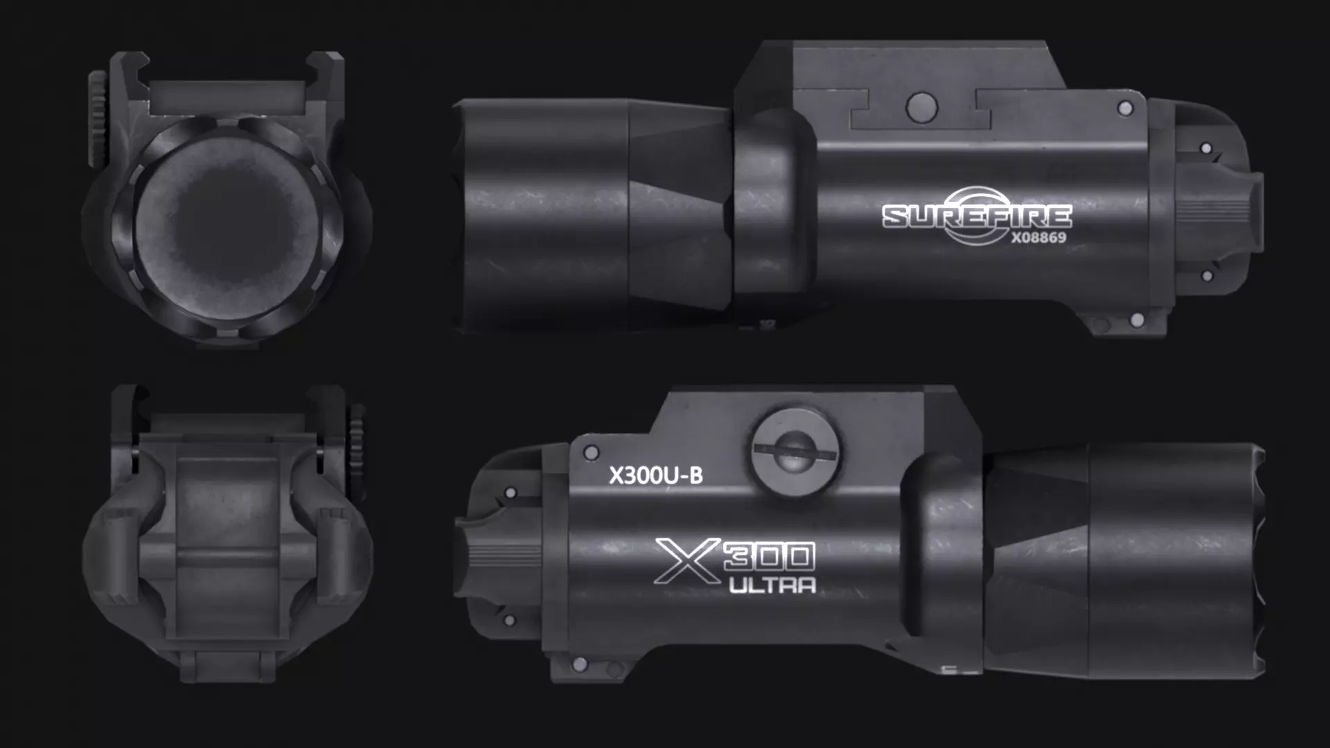 SureFire X300 Ultra-B, tactical pistol flashlight attachment. Can be fitted on any firearm that has a M1913 Picatinny Rail system. This product will feature a low poly model with high poly baked details, for use in FPS games. The Pistol in the screenshot is NOT included. Please note that proportions may not be 100% correct. This model isn't made for 3D printing, it was made for use in games.