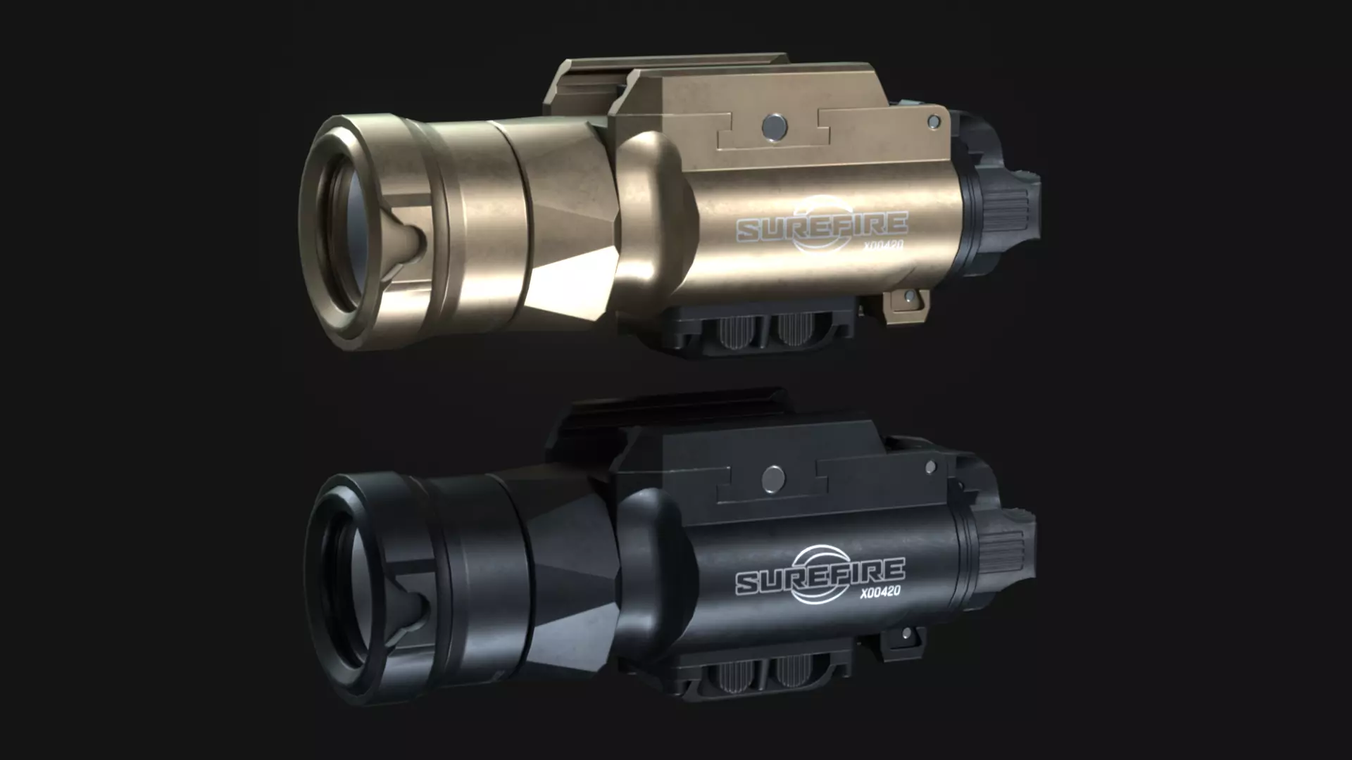 SureFire XH35, tactical weapon flashlight attachment. Can be fitted on any firearm that has a M1913 Picatinny Rail system. This product will feature a low poly model with high poly baked details, for use in FPS games. The Pistol in the screenshot is NOT included. Please note that proportions may not be 100% correct. This model isn't made for 3D printing, it's a low poly asset made for use in games.