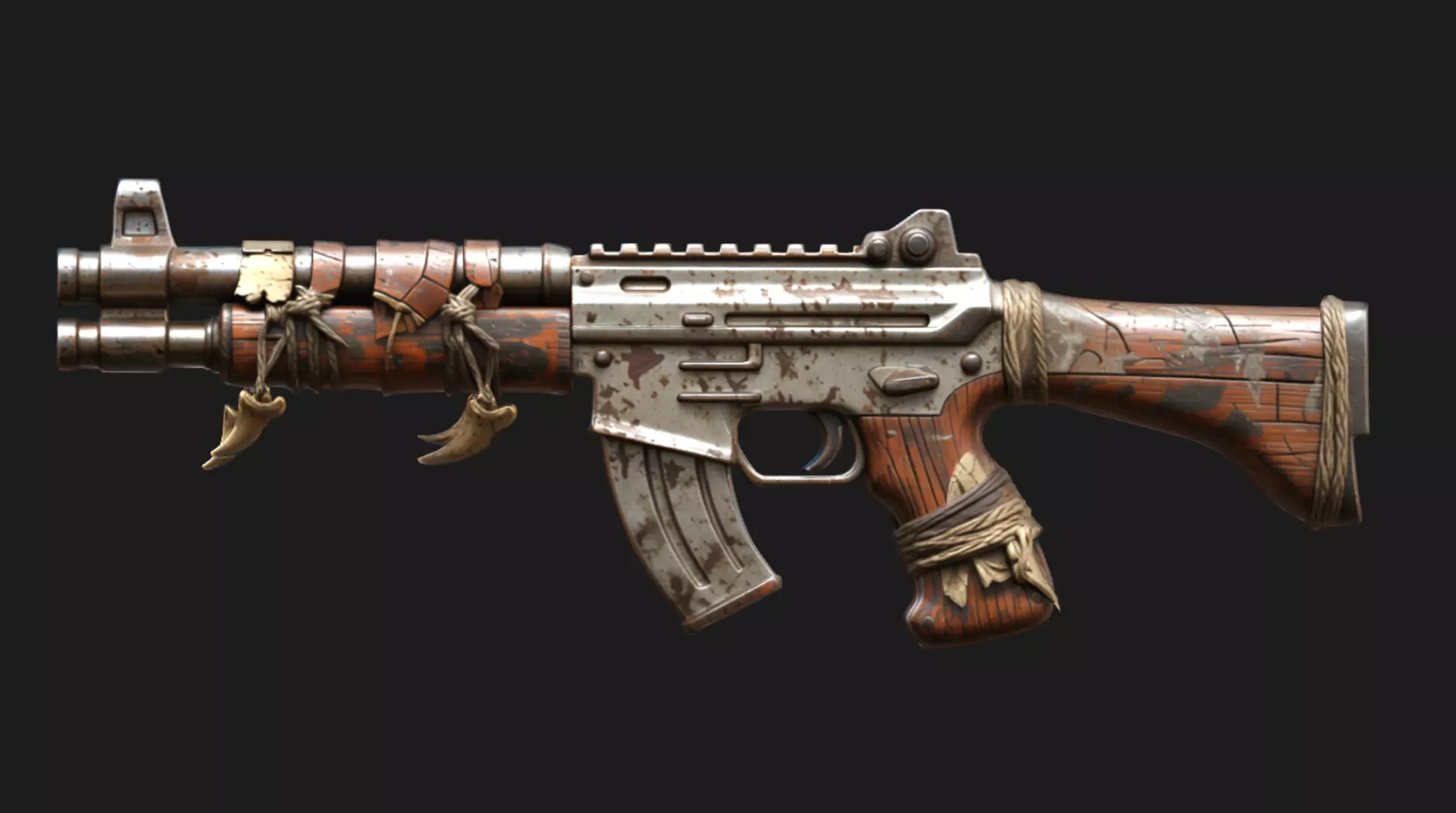 This weapon features a worn metal receiver, handcrafted wooden stock, rope bindings, and decorative bone charms that enhance environmental storytelling. Surface rust, chipped paint, and edge wear create a realistic, battle-worn appearance.