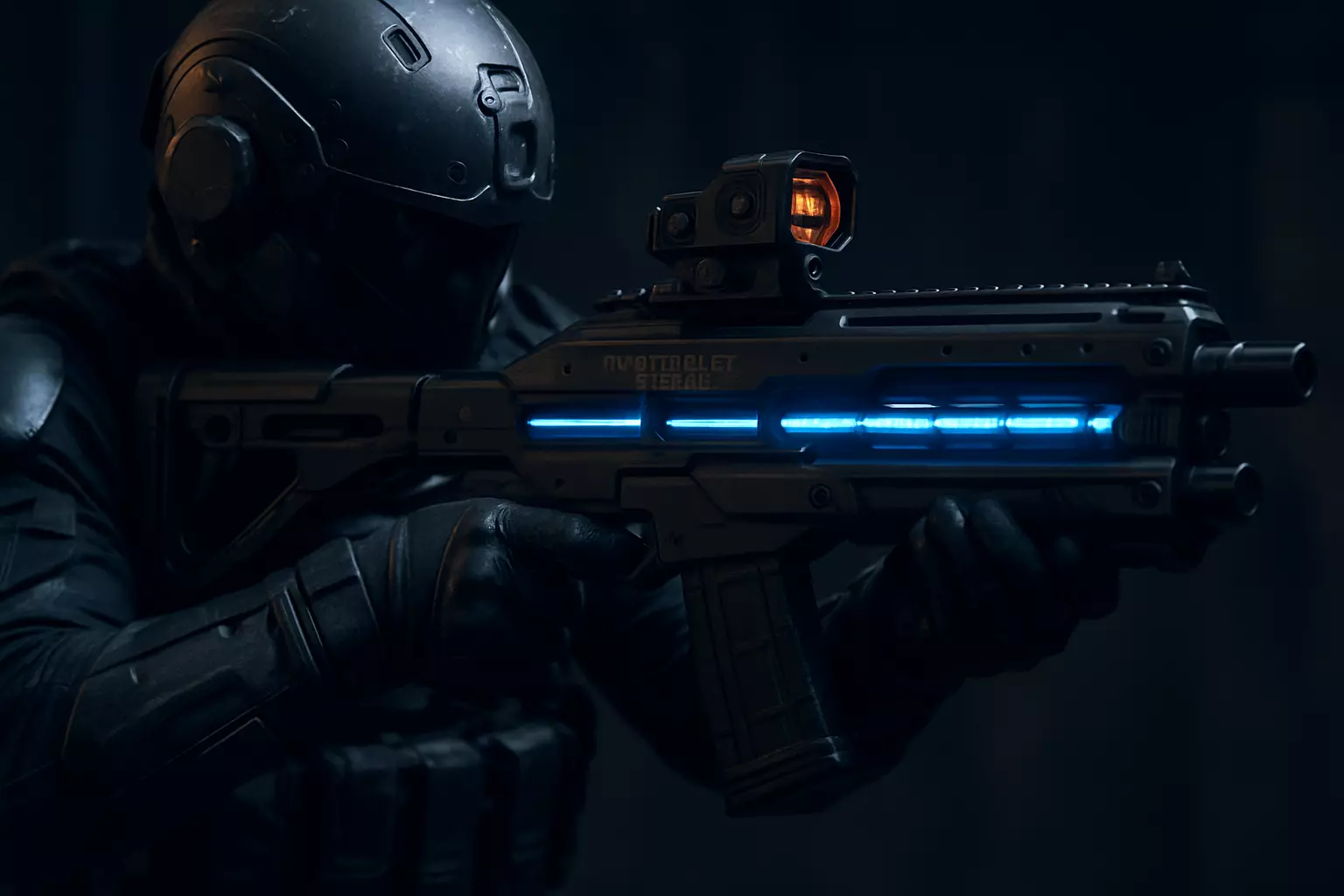This advanced gaming weapon represents the pinnacle of future military technology, combining elegant design with deadly efficiency. The sleek metallic frame features a combination of matte and glossy surfaces that highlight its sophisticated engineering. Intricate mechanical components are visible through strategic cutouts in the casing, revealing the complex inner workings.The weapon's most distinctive feature is its energy system, with subtle blue energy conduits running along the barrel that pulse with power. These energy channels converge at the muzzle, suggesting tremendous firepower. The ergonomic grip is designed for maximum comfort during extended gameplay sessions, with tactile finger grooves and a non-slip surface.Tactical attachments include a holographic sight system, under-barrel stabilizer, and modular rail system for customization. The sophisticated targeting system projects battlefield data directly into the user's field of vision. Realistic wear marks and subtle scratches add authenticity, suggesting this weapon has seen action while maintaining its formidable appearance.The balanced proportions and functional design elements make this weapon not just visually impressive but also believable as a practical combat tool in a futuristic gaming universe.