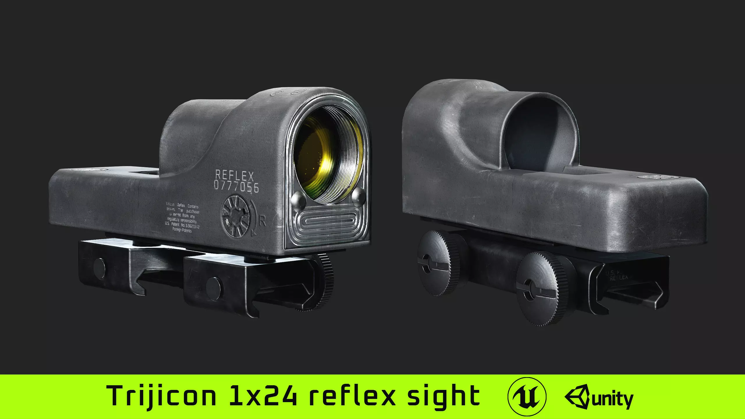 Lowpoly and realistic Trijicon 1x24 reflex sight with trijicon flaptop and gooseneck mounts 3d models optimized for game engines or any other usage in 3d software.