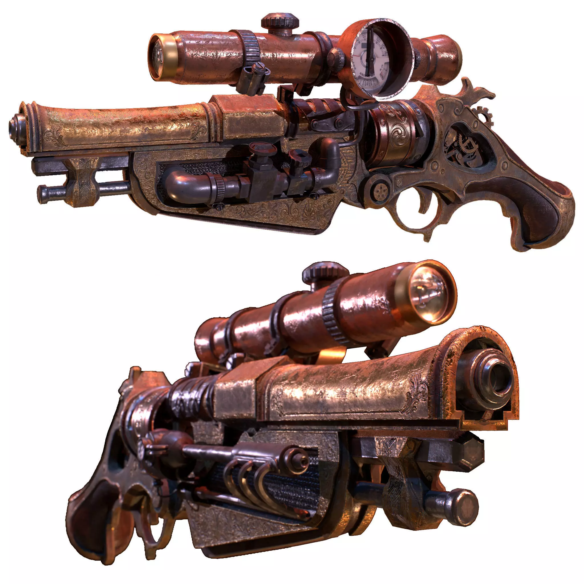 Rusty Victorian gun concept from ruins of an old temple.Version: 2015PBR Textures: YesPreview: YesUnits: CentimetersDimension: 115.22 x 32.81 x 47.78Polys: 46.298XForm: YesModel Parts: 2Render: Corona, Vray