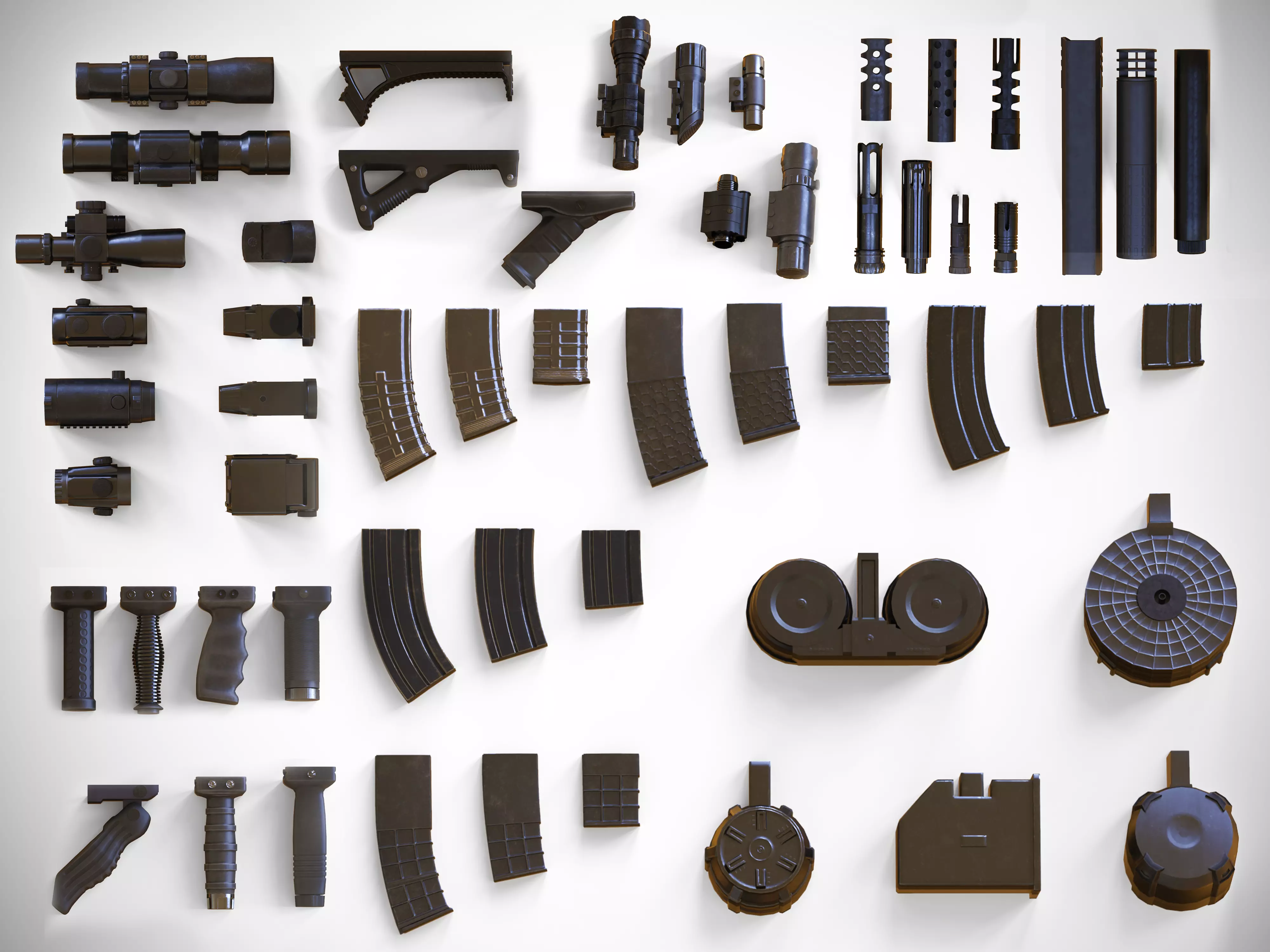 A stunning, highly detailed collection of 57 weapon (gun) attachments.The perfect weapon customization collection!