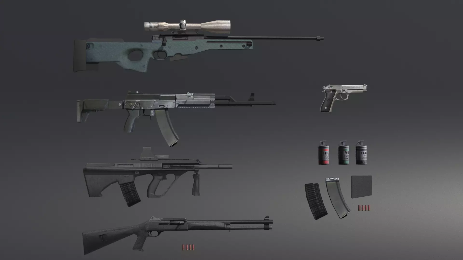 Each weapon has 2 seperated objects (Riffle and Mag/shell)texture size 1k for each object , pbr textures(diffuse,metallic,roughness,normal)