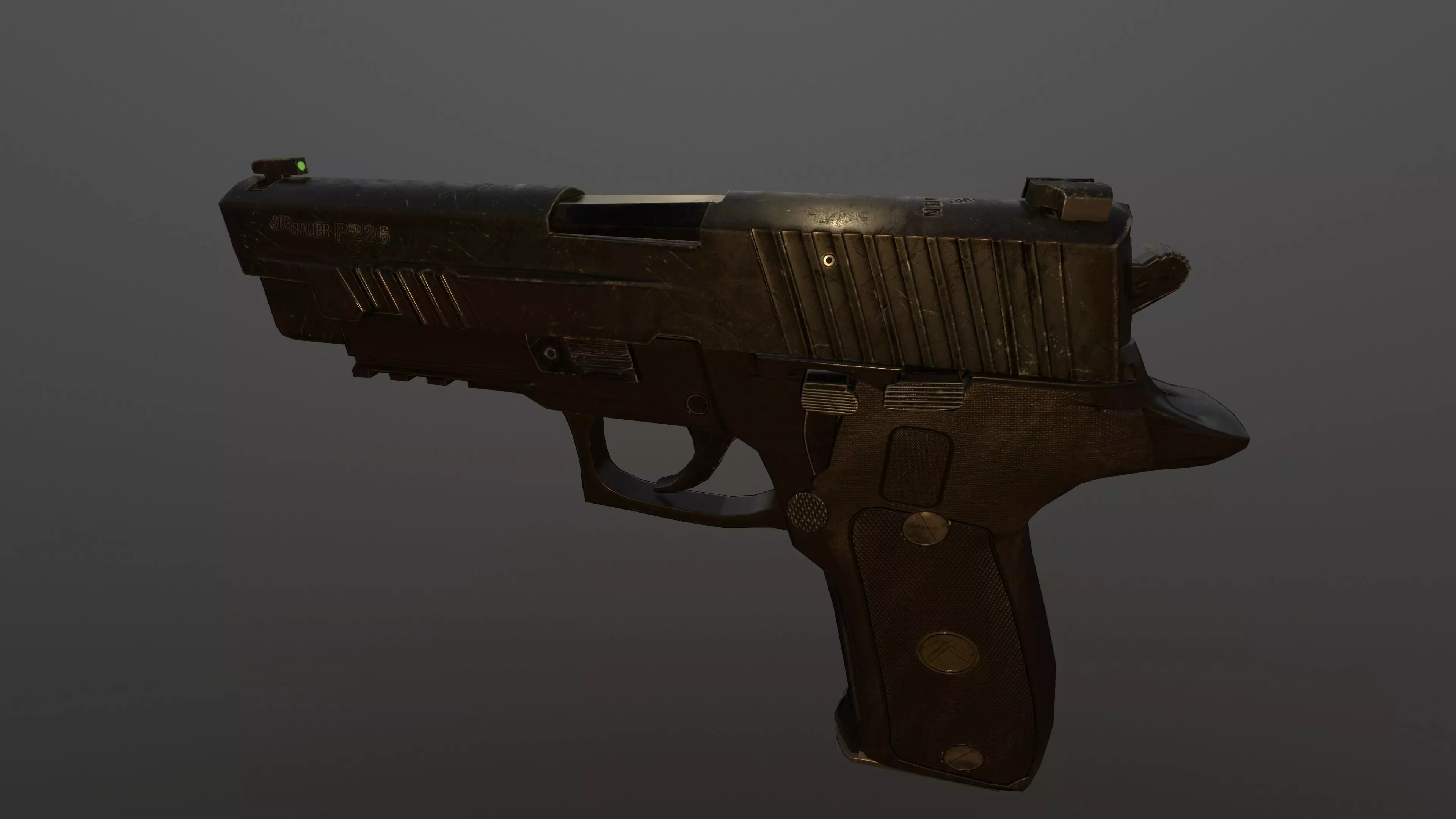 A model made after the SigSauer P226 Legion pistol, the model is very worn, since most people owning such a pistol take very good care of it, this is one of the few models in which the pistol looks like it's been through war.