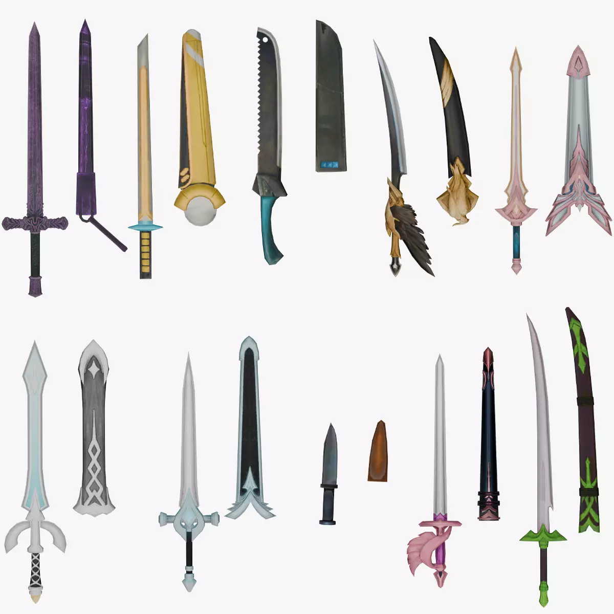 Models designed and rendered in Blender 4.0These are 10 different Low-Poly Sword(with scabbards) models Pack 2(Including the sword holder and belt seen in the photos) .The coloring was done for sample purposes, you can easily change it as you wish.Textures - Diffuse, Normal, Alpha, Metalness, Roughness, Specular -- Resolution : 1024x1024 -- Format : BG Transparent .pngFiles - .blend - .fbx(with colors)- .objTotal Polygons : 14131Total Vertices : 7635All named with material applied and sorted in collections .Good topology, suitable for reuse to create new sword models.Thanks for your interest.