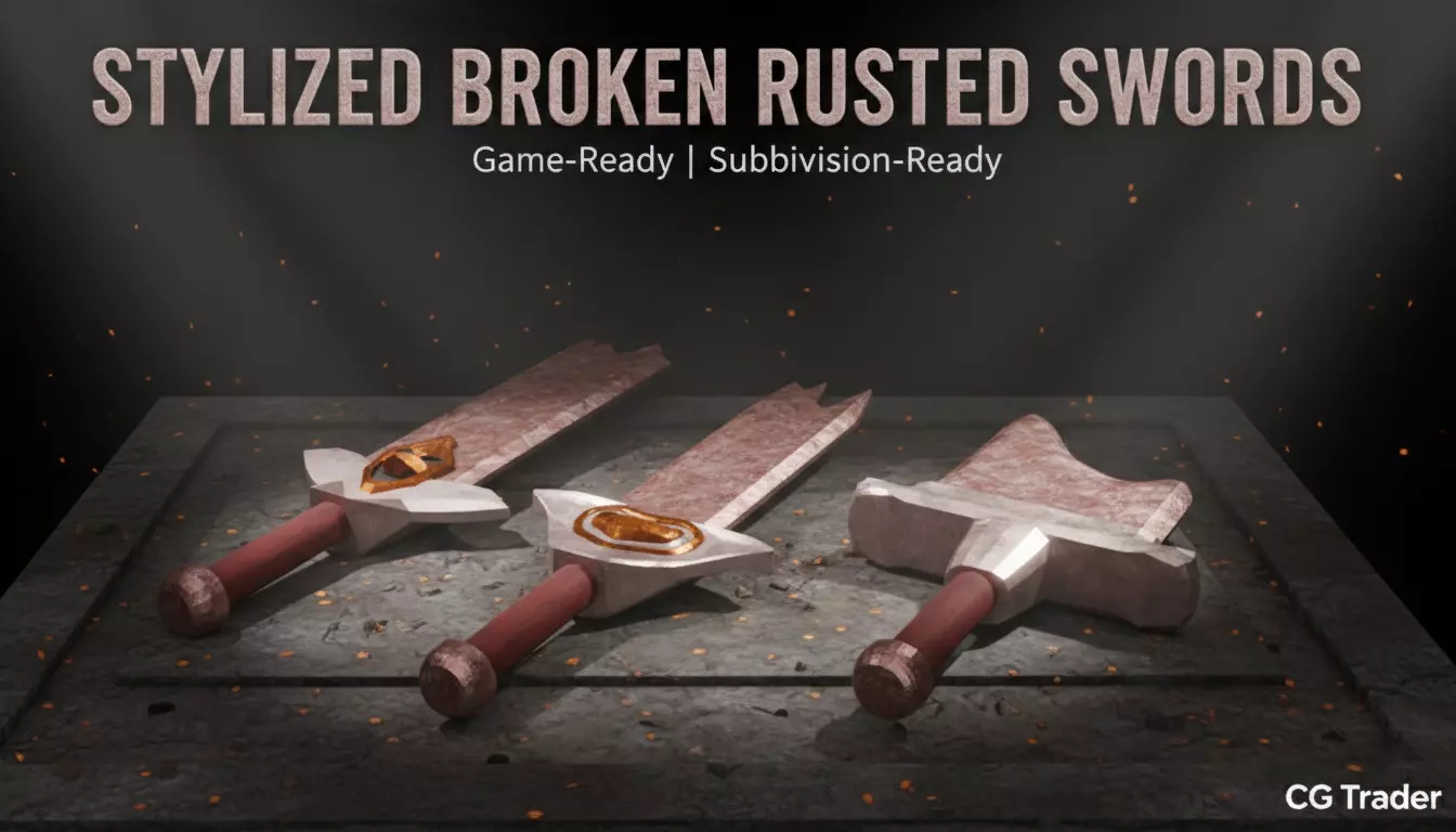 This set features a collection of three stylized, broken swords, expertly crafted to balance a hero asset aesthetic with optimized performance. These models are ideal for fantasy RPGs, soulslike environments, or as decorative environmental storytelling pieces.