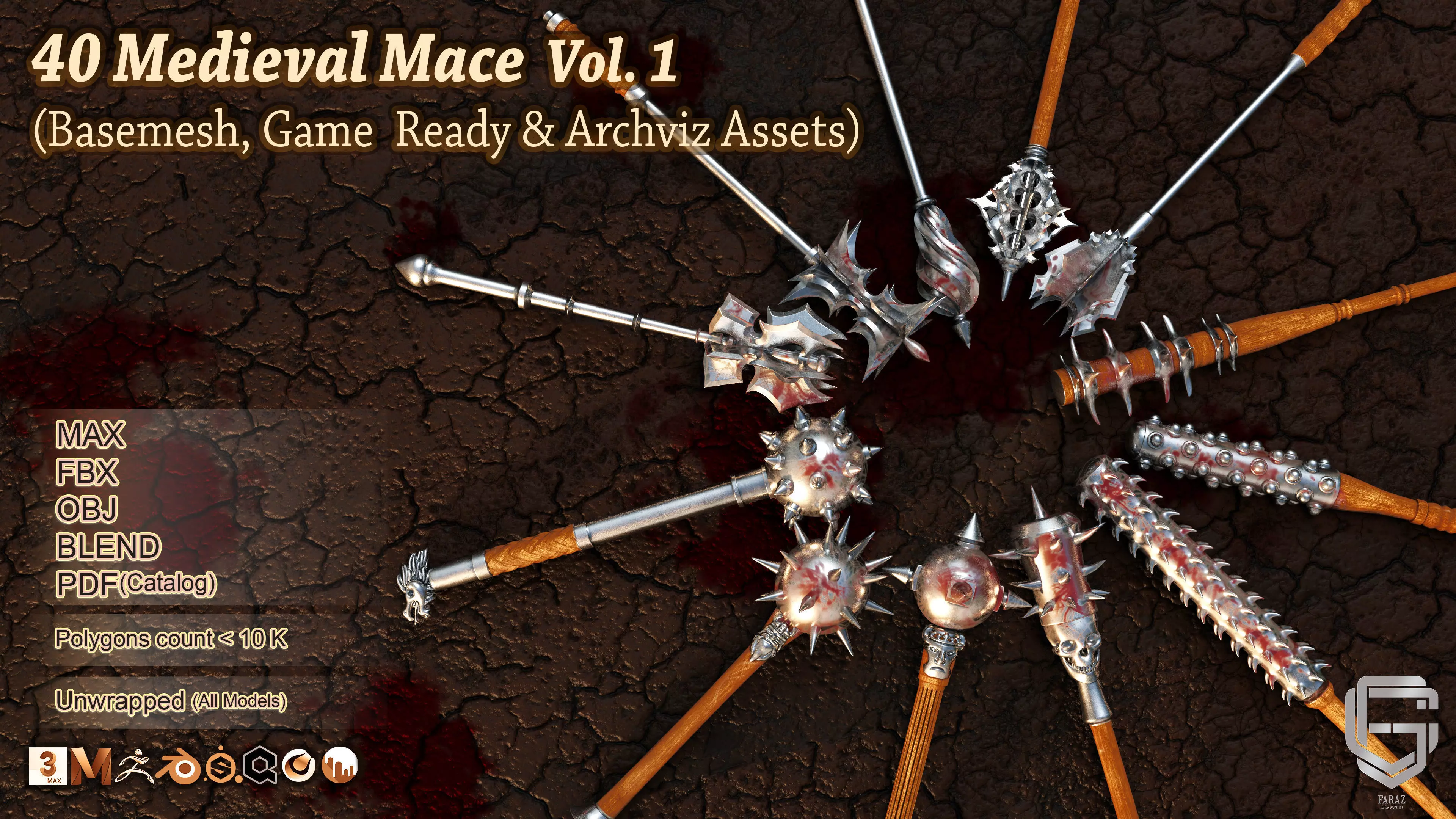 - What’s Included- 40 fully unique medieval mace designs- Each model under 10,000 polygons- Clean topology (Quad & Triangle only)- Fully unwrapped UVs- Subdivision-ready geometry (supports Divide/TurboSmooth)- Organized and clean scene files-