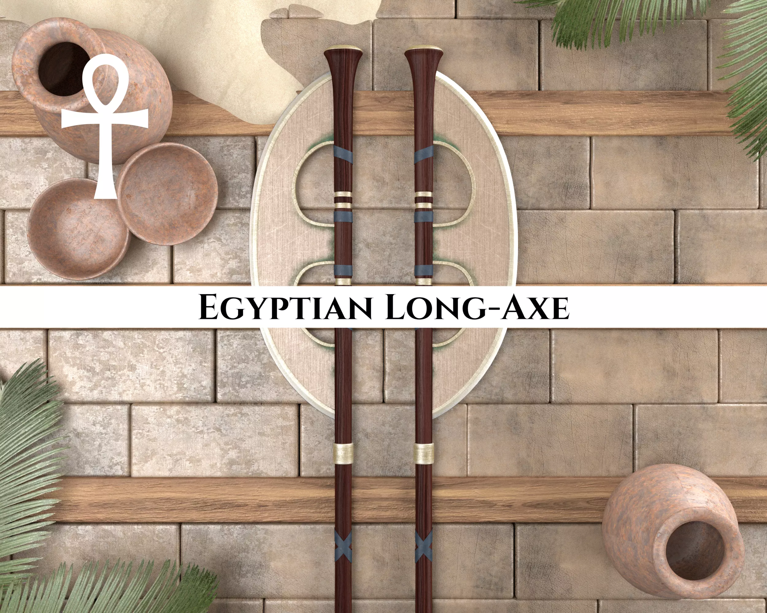 This model is part of the Egyptian Weapons set. Weapons in this particular style feature handles and hilts that are carved from a dark wood. Decorative gold trimmings give them an ornate look. Weapons of this era and region were often made of bronze, which is why a green patina can be seen.