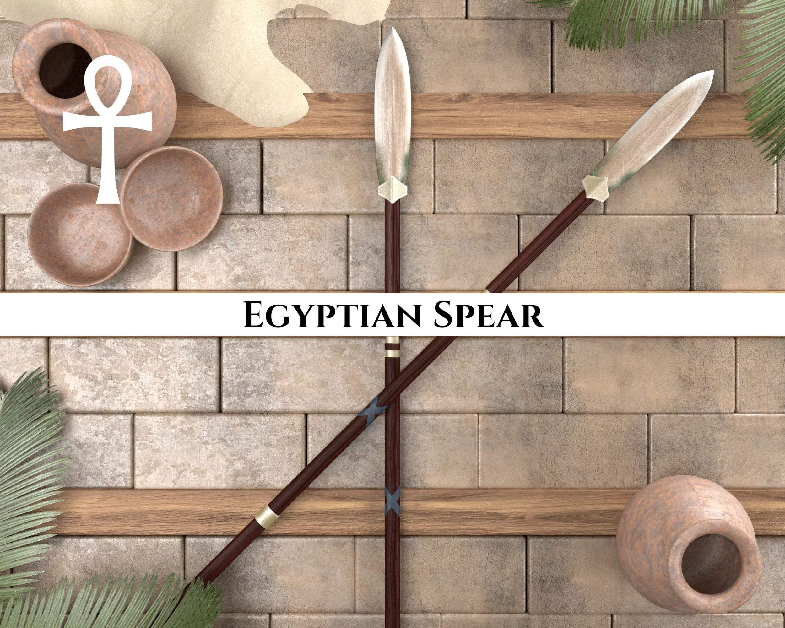 This model is part of the Egyptian Weapons set. Weapons in this particular style feature handles and hilts that are carved from a dark wood. Decorative gold trimmings give them an ornate look. Weapons of this era and region were often made of bronze, which is why a green patina can be seen.