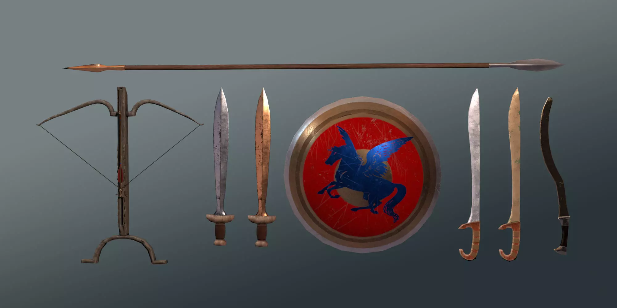 Included:Xiphos Sword - Bronze and Iron variantsBronze Harpe SwordKopis Sword - Bronze and Iron variantsHoplon (Shield)SpearGastraphetes (Primitive Crossbow)