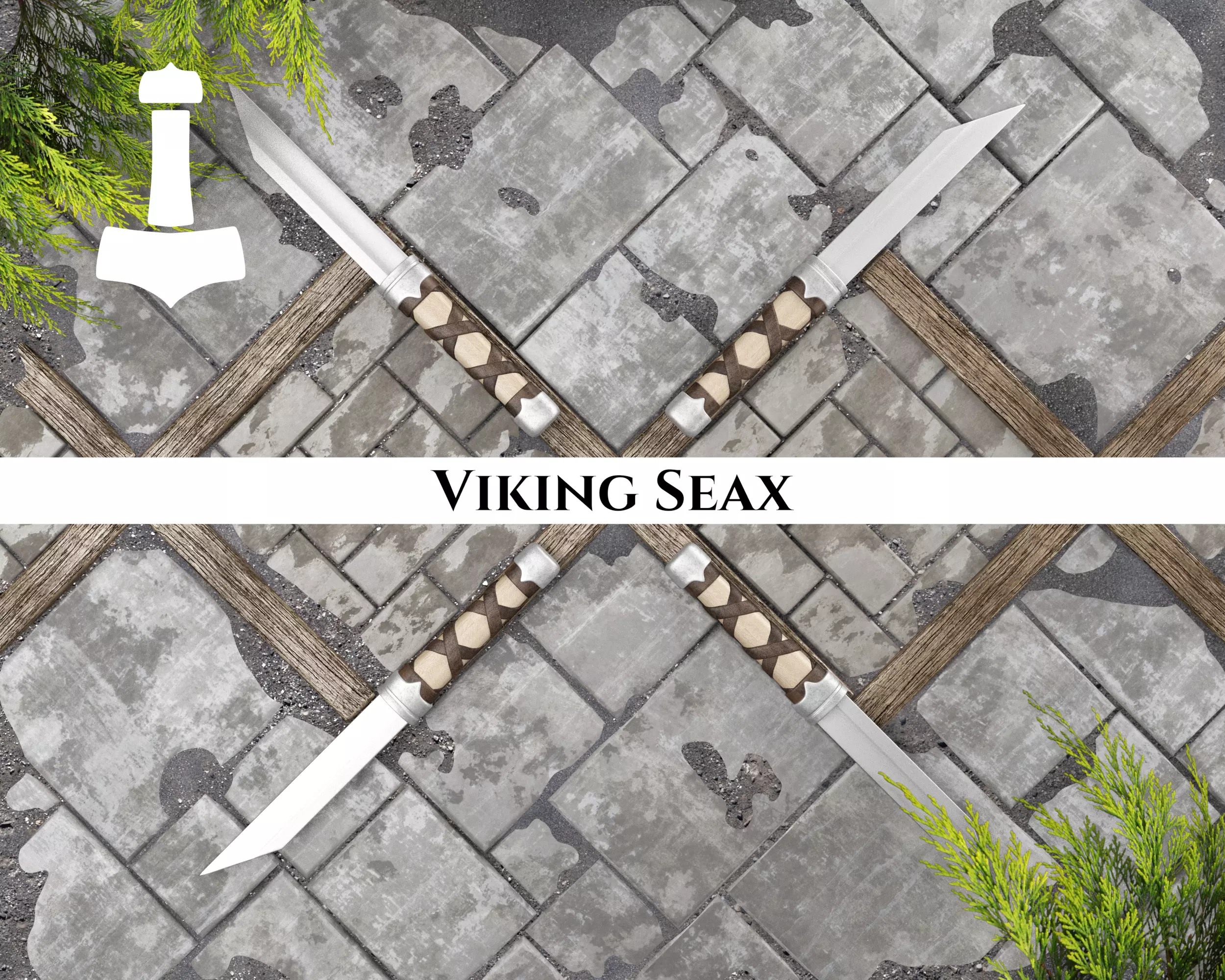 This model is part of the Viking Weapons set. The weapons in this set feature decorative yet simple hilts and pommels. They're constructed from a base of light wood shafts and grips which are wrapped in leather. The blades are thicker at the base and thin out near the tip with a fuller running the entire length. During the Viking Age, many blades were pattern-welded, which is why these weapons have a distinct ripple texture.