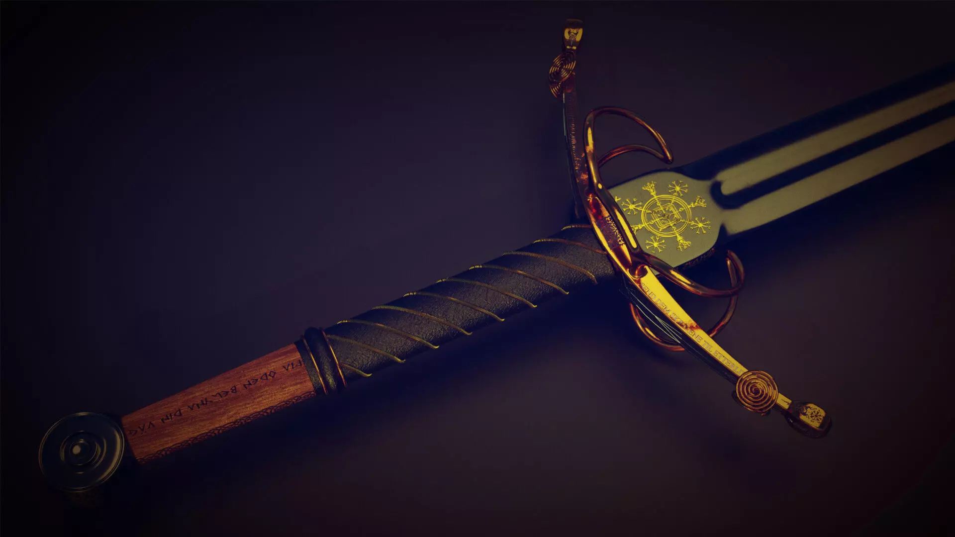 This is a model of a medieval bastard sword, inspired by the one found in a popular medieval multiplayer game called Mordhau.It is 120 cm long, 71 cm wide at the crossguard, and 2.5 cm high. It is decorated with nordic runes and Swedish and Norwegian writing. It includes phrases like Send dem skrikende inn i etterlivet! or Send them screaming into the afterlife. I did not go with any specific style with this sword.It was modeled, textured, and rendered in Blender Cycles. I've exported the model into other formats but the materials are not 100% going to translate correctly to other software.All the necessary textures are packed in the blend file.The model mesh is not watertight so if you wish to print it, you will need to make a few modifications.This is a high poly model and while it can be used in a game, it is not recommended as the mesh is not as optimized as it could be.The engravings were made by painting a black&white mask in photoshop on top of the UV layout. The same technique has been used to create the transition between leather and wood.Most of the runes were made with an online translator while some of them were drawn by my good friend.All the material textures were downloaded from Texture Haven.