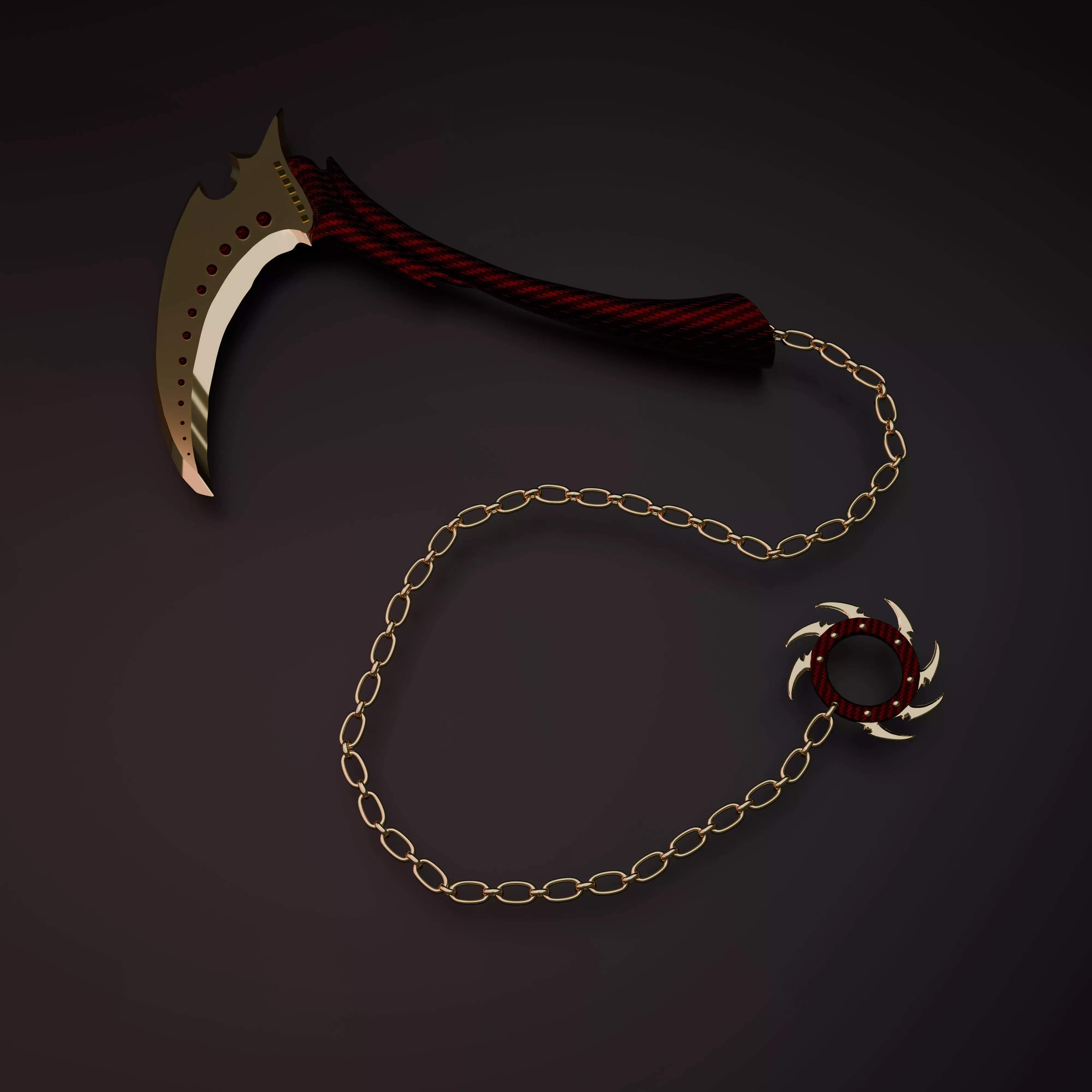 Visual FeaturesIconic Design: Faithful recreation of the curved golden blade and the spiked counterweight ring.Detailed Texturing: Features a distinctive crimson and black woven carbon-fiber style handle that contrasts beautifully with the metallic gold elements.Dynamic Chain: Intricately modeled chain links connecting the sickle (kama) to the weight, designed for dynamic posing.
