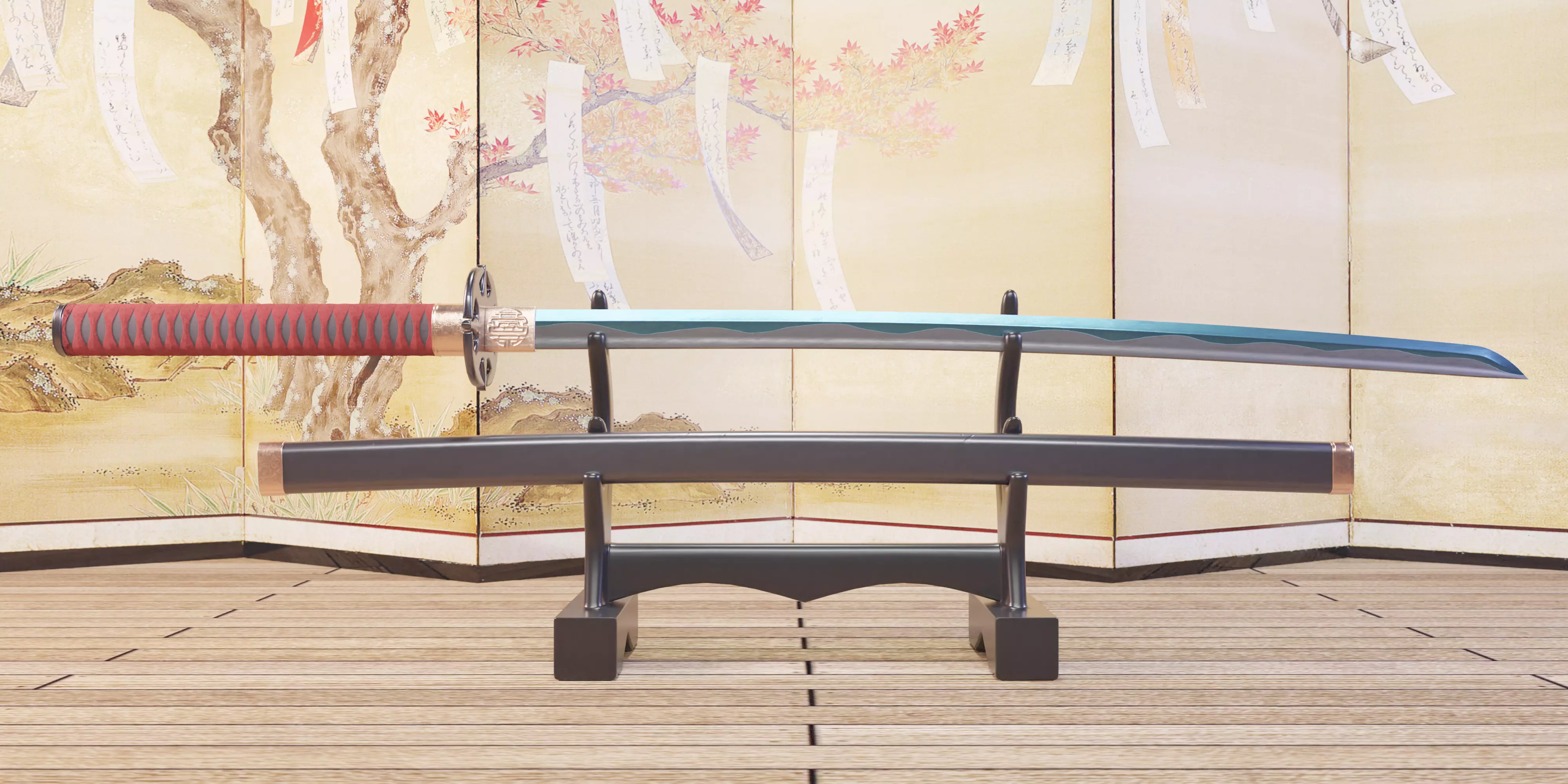 This contains realistic model of katana with blue blade in blender file, which contains seperate objects such as i.e., blade, handle, cloth, cover etc., and can be joined to single object with high resolution 2K textures and fbx file.
