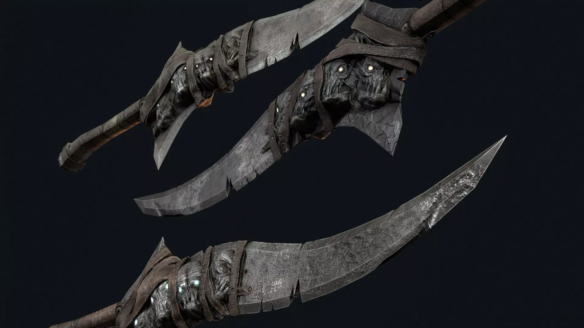 The blade is decorated with embedded skulls, adding a sinister and aggressive silhouette that enhances its presence as a boss-tier weapon. The model features PBR textures and is prepared for easy integration into game engines. The grip is positioned at world zero for convenient placement and attachment, and the model is oriented along the Z axis. The asset includes 2K and 4K textures, making it suitable for optimized real-time use as well as more detailed cinematic scenes.