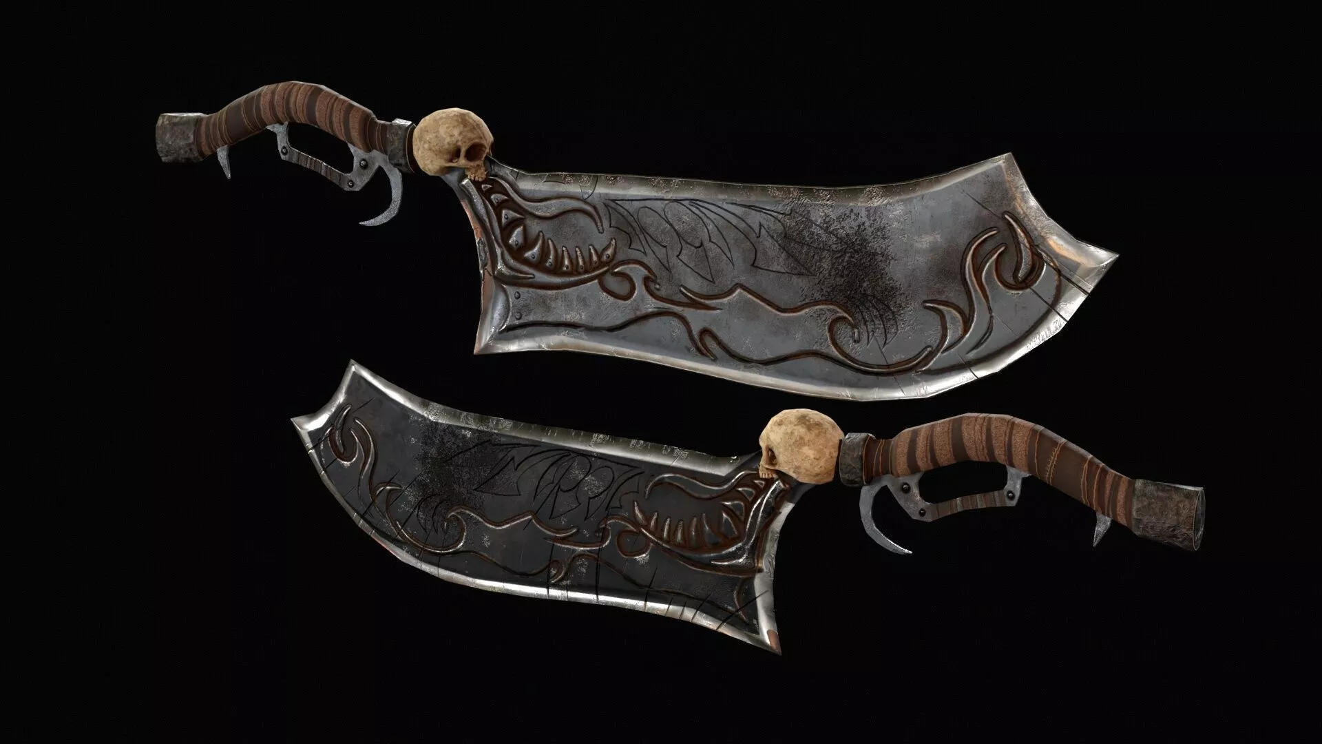 The design features a massive cleaver blade combined with a sinister skull on the guard, creating a menacing and memorable silhouette. The model includes PBR textures and is prepared for easy integration into game engines. The grip is positioned at world zero for convenient placement and attachment, and the model is oriented along the Z axis. The asset includes 2K and 4K textures, making it suitable for optimized real-time use as well as more detailed cinematic scenes.