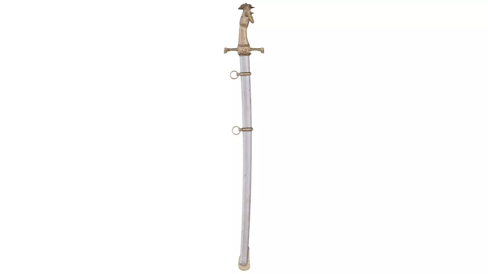 3D scanned model featuring a sword with a gold handle and a white handle. This model, chicken sword, has been created using photogrammetry from a real world object.The raw scan data has been cleaned, retopologized and UV-unwrapped using Zbrush. The result is a low poly mesh with baked maps. The .obj and .mtl are configured so that maps will load automatically in the shader (tested in Blender). In addition, a Blender scene is provided with the model and shader already set up for rendering and export. Detailed information below: