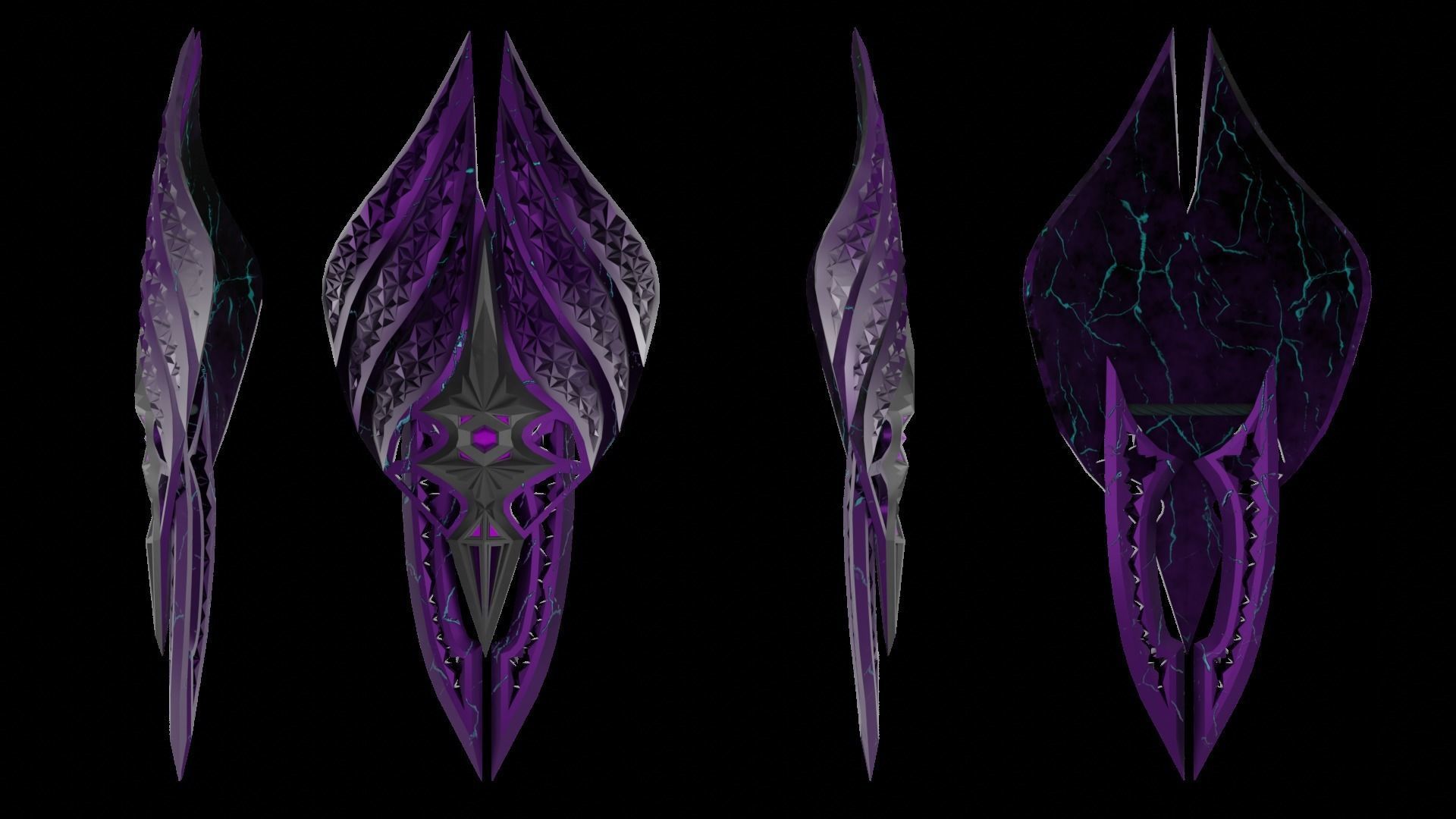 A model of an attacking, crystalline, kite-shaped purple shield with blue veins. Sharp blades protruding in the lower part of the shield allow you to deliver not only chopping blows, but also lunges. The shield consists of crystal veins of violet-silver color with a decoration in the center of black diamond with taffeyite crystals inlaid in it. On the reverse side, you can see a handle wrapped in leather to avoid slipping and for better control of the shield during combat.