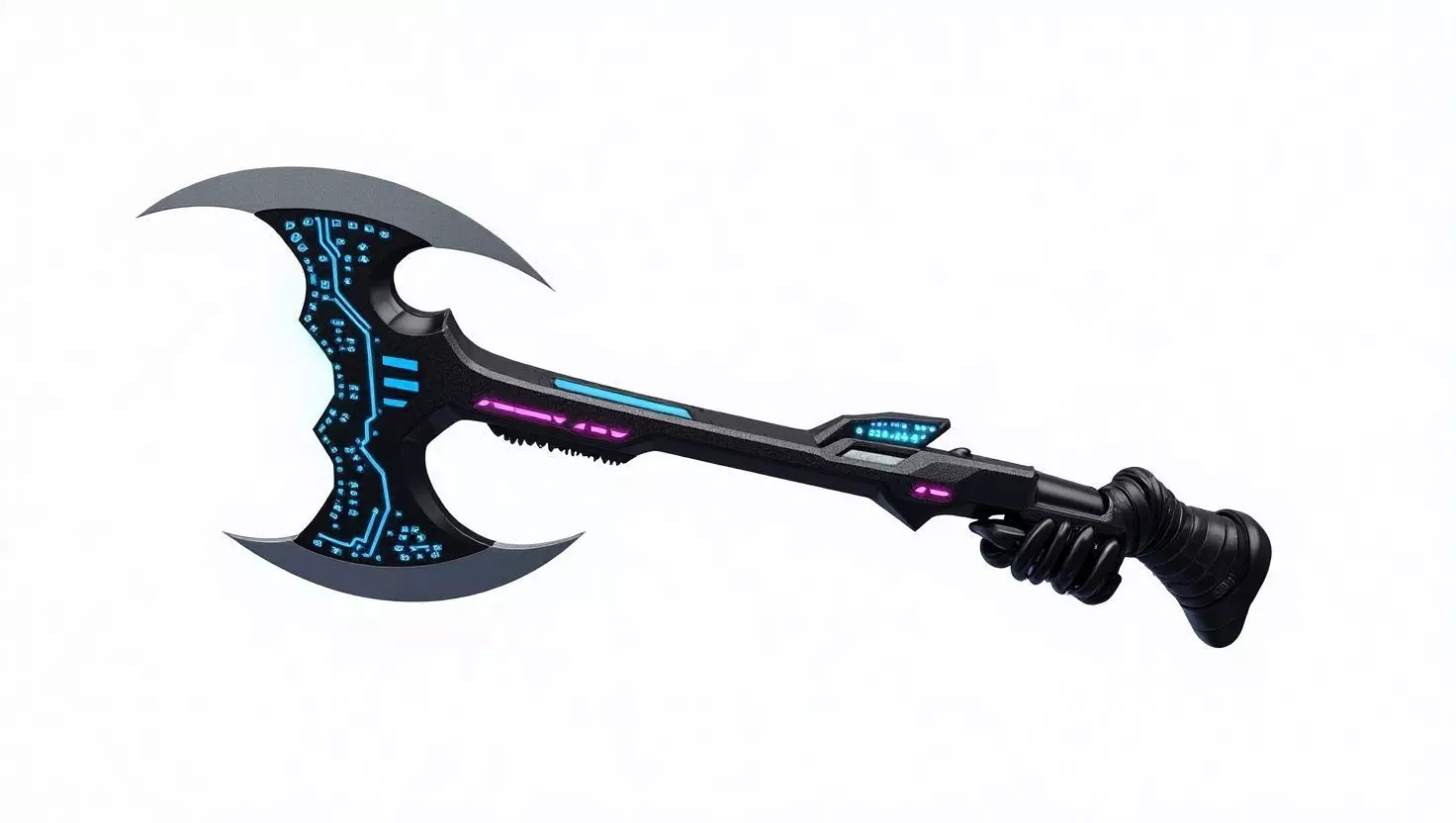 Futuristic double-bladed battle axe 3D model featuring sleek cyber aesthetics with glowing blue circuit patterns and purple LED accents. This sci-fi weapon combines brutal effectiveness with high-tech design, featuring a serrated center spine and dual curved blades. The handle includes tactical ribbing and mechanical components for enhanced grip and control.