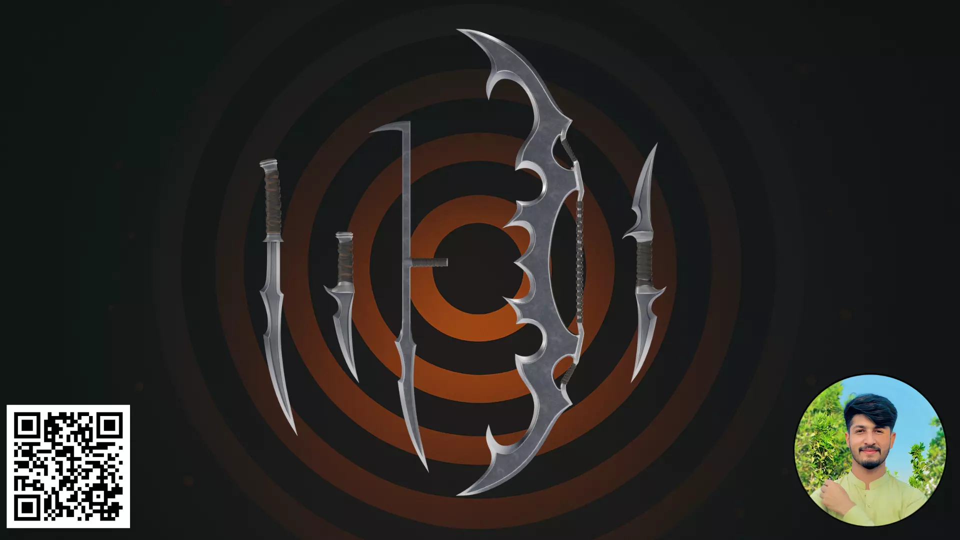 This is a premium 3D collection titled Dark Fantasy Blade, featuring a variety of lethal, stylized melee weapons designed for dark fantasy RPGs, soul-like games, and cinematic projects. The set includes multiple aggressive daggers, a unique pole-arm, and a massive dual-sided bladed weapon, all sharing a consistent weathered-steel aesthetic.