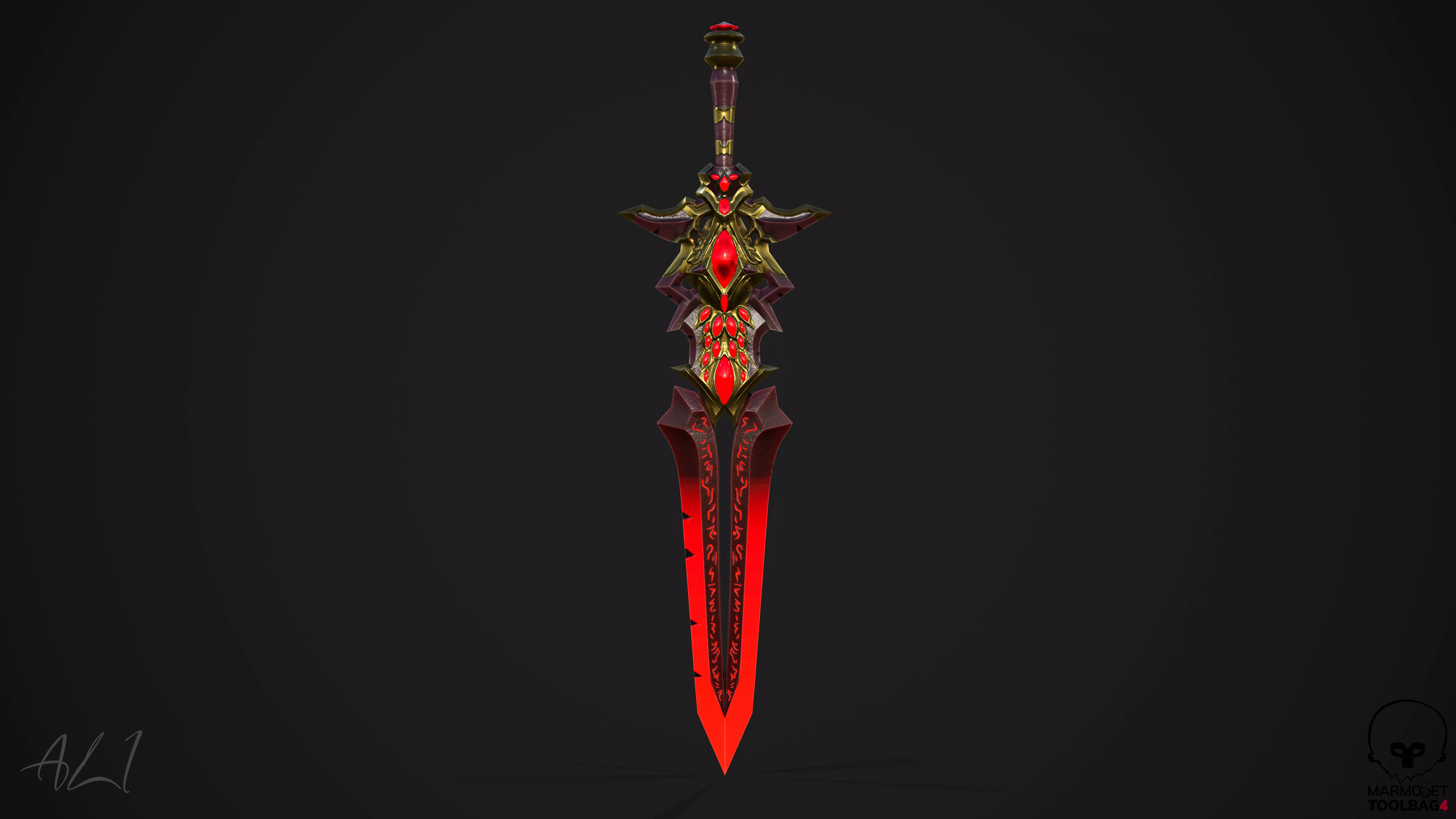 Visual Storytelling: The Blood-Rune etchings and the ruby-encrusted hilt tell a story of ancient power and cursed magic.