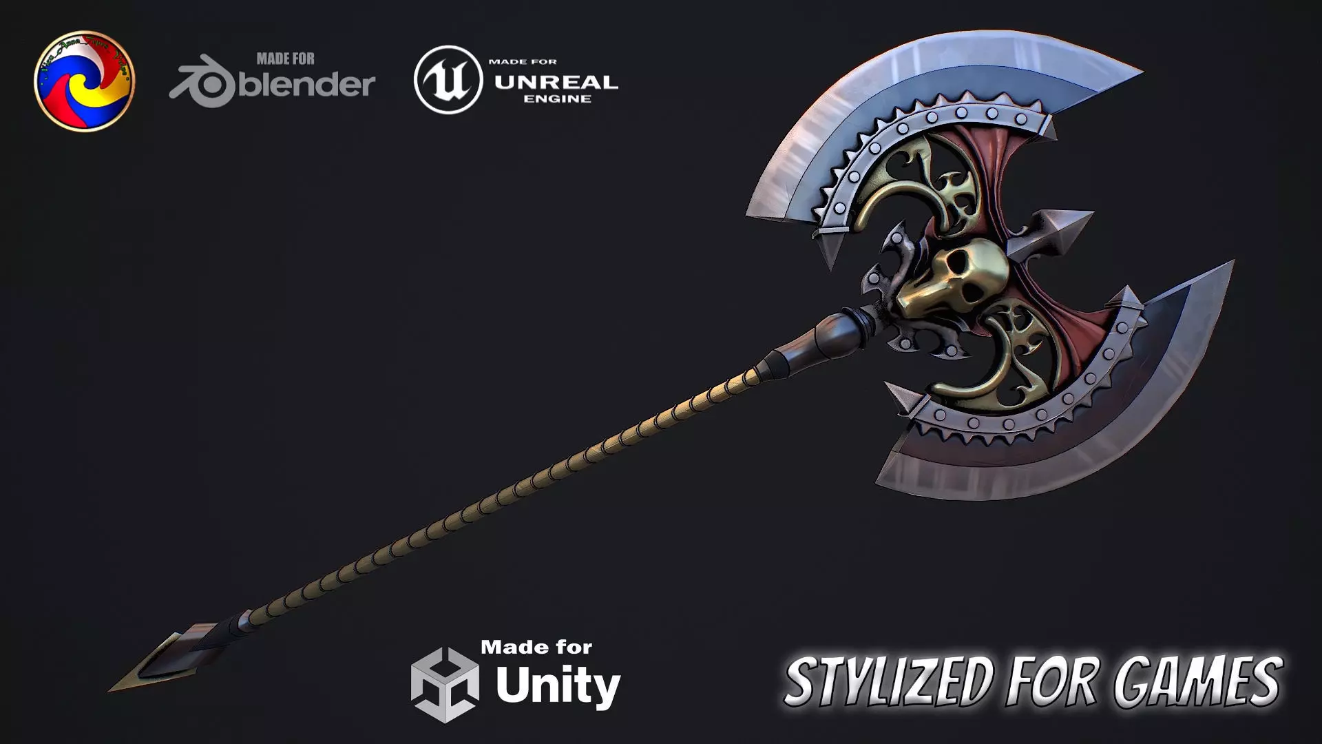 Hello. This is a high definition quality polygon of a Fantasy axe 1 Stylized game ready 3D Model with PBR textures. Extremely detailed and realistic. Suitable for movie prop, architectural visualizations, advertising renders, games, VR, AR and other. The archive includes Obj and FBX, Marmoset scene, Blender scene, HDRI, textures for the PBR: Base color, Metallic, Mixed AO, Normal_OpenGL, Roughness. And also included in the archive textures for UE: BaseColor, Normal, OcclusionRoughnessMetallic. All textures are 2k resolution. The model contains 1 object: Fantasy_axe_1
