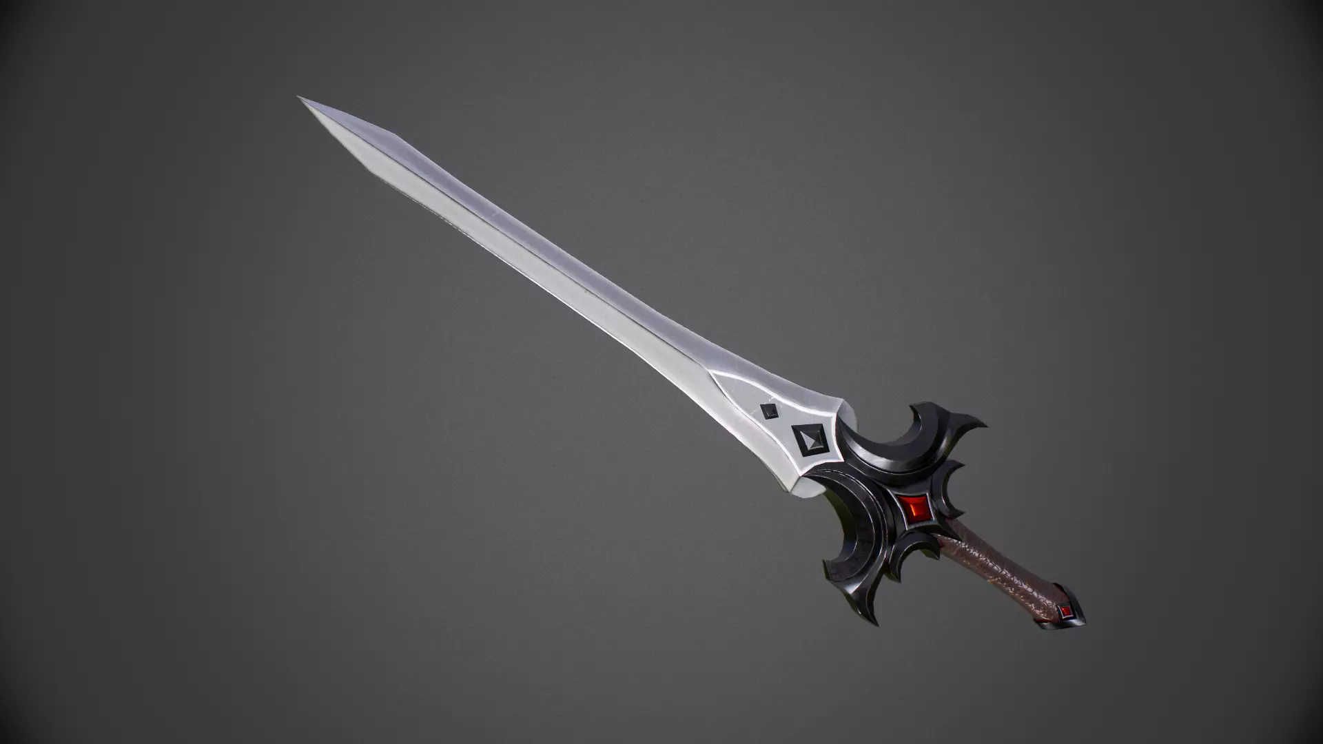 This is a model of a realistic fantasy dark sword with dark guard and inlaid red stone.