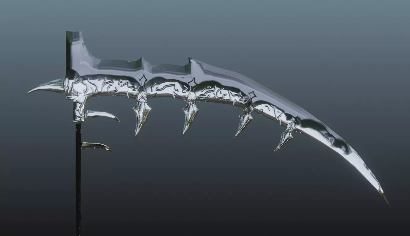A fantasy scythe melee weapon with jagged/spiked blade and light carvings in the metal. Made with Blender and Substance Painter.