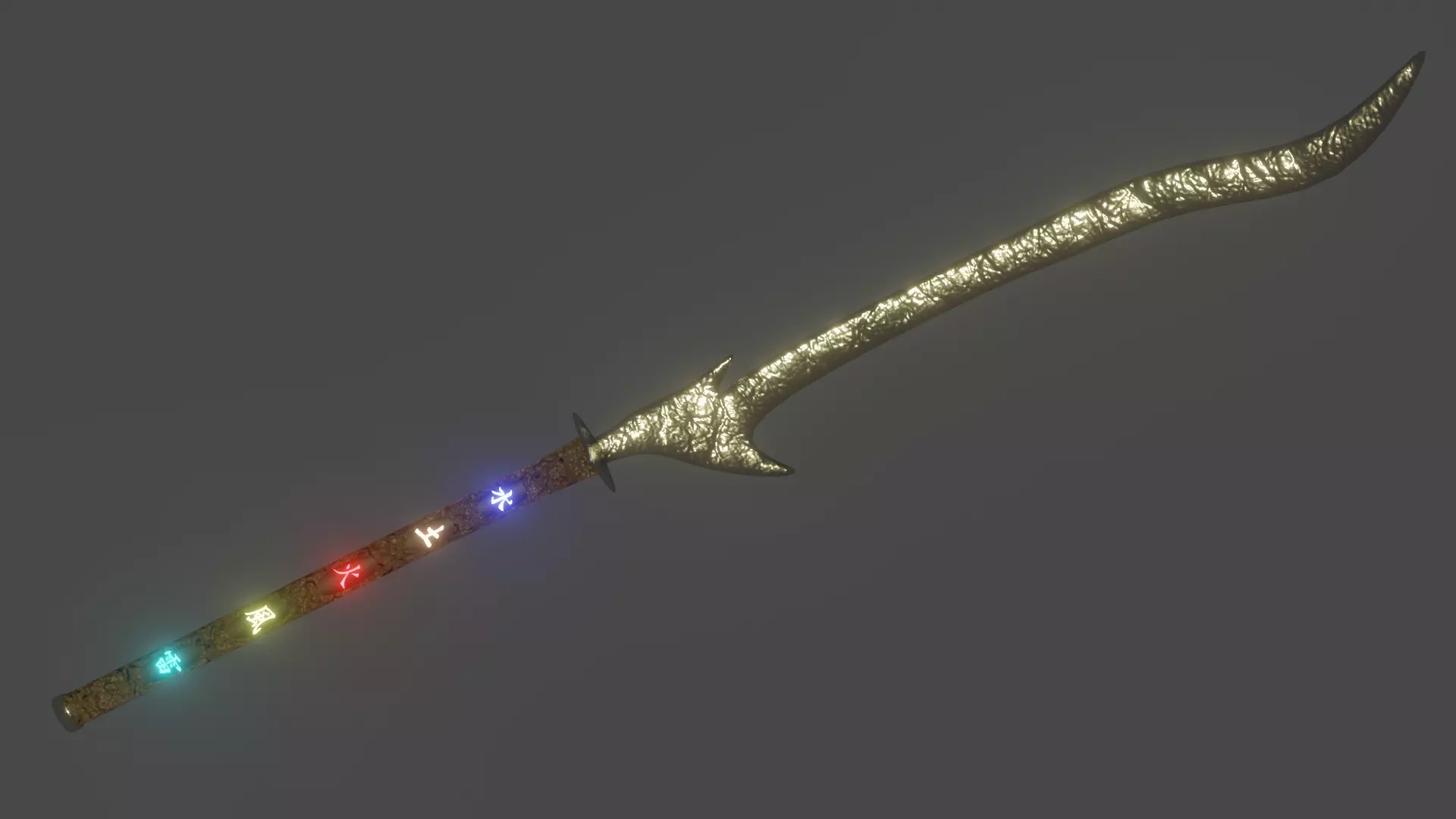 A steel sword in a fantasy style, a wooden handle covered with leather, there are glowing hieroglyphs, create blenderVert 52880Faces 52784